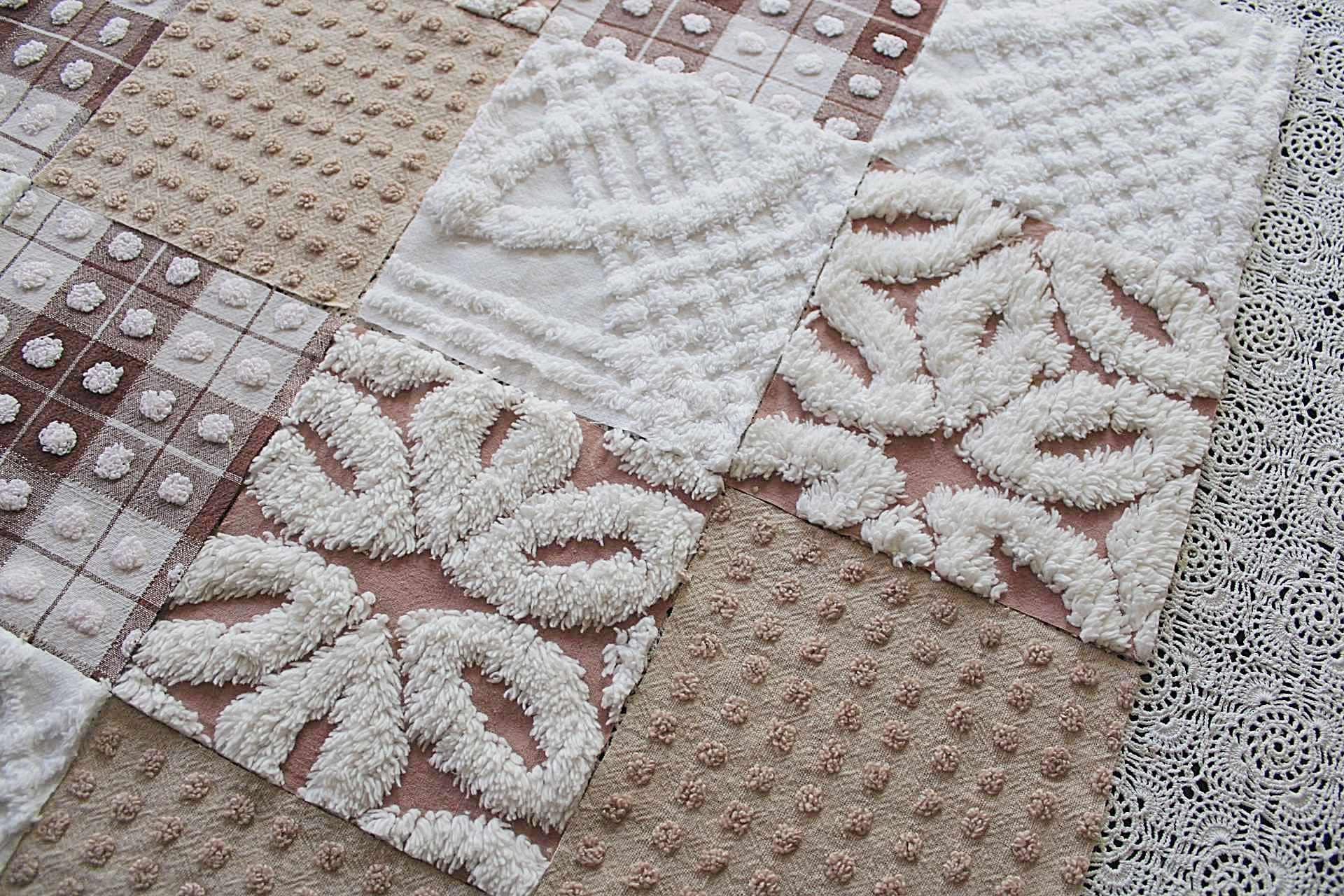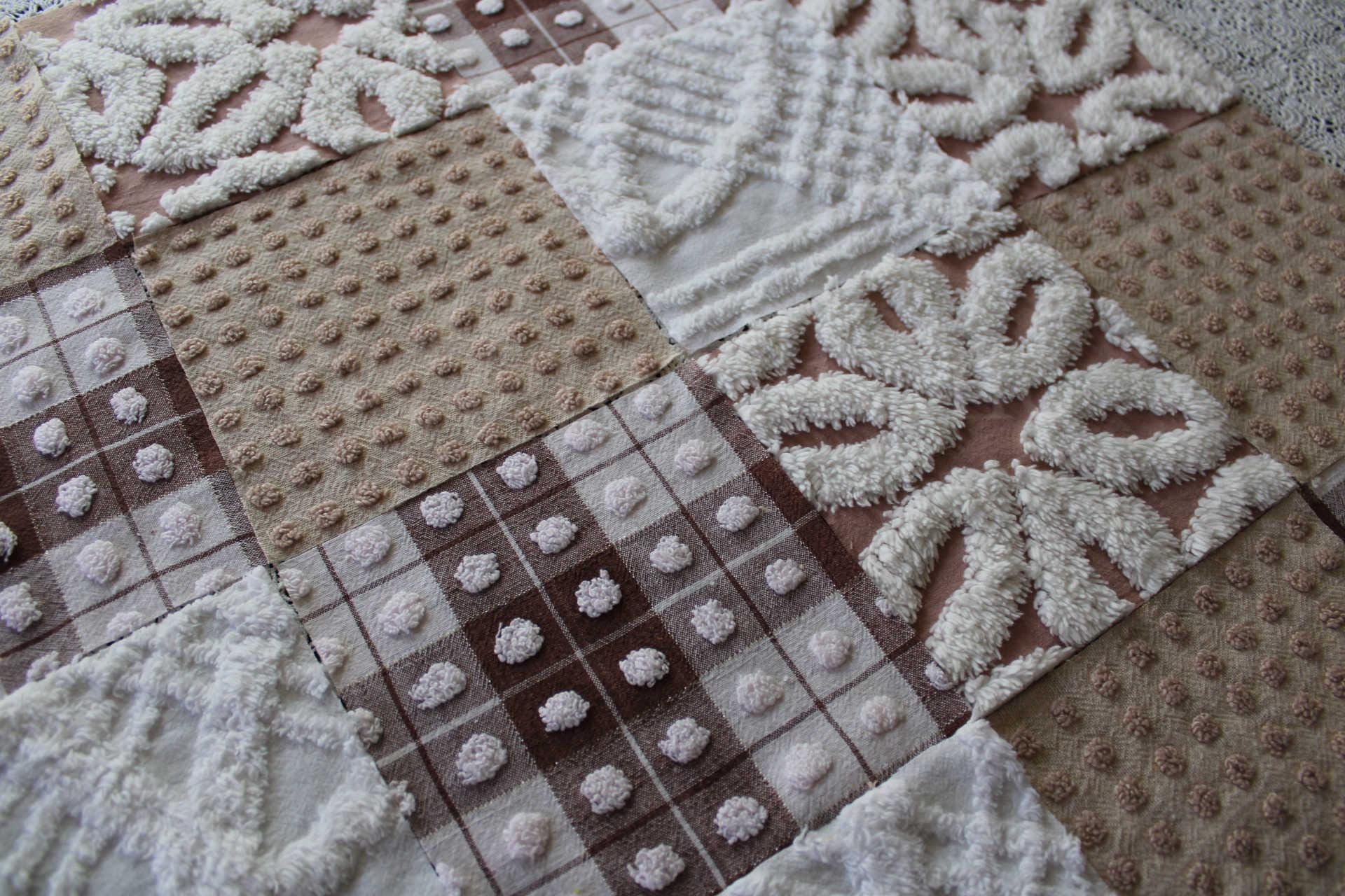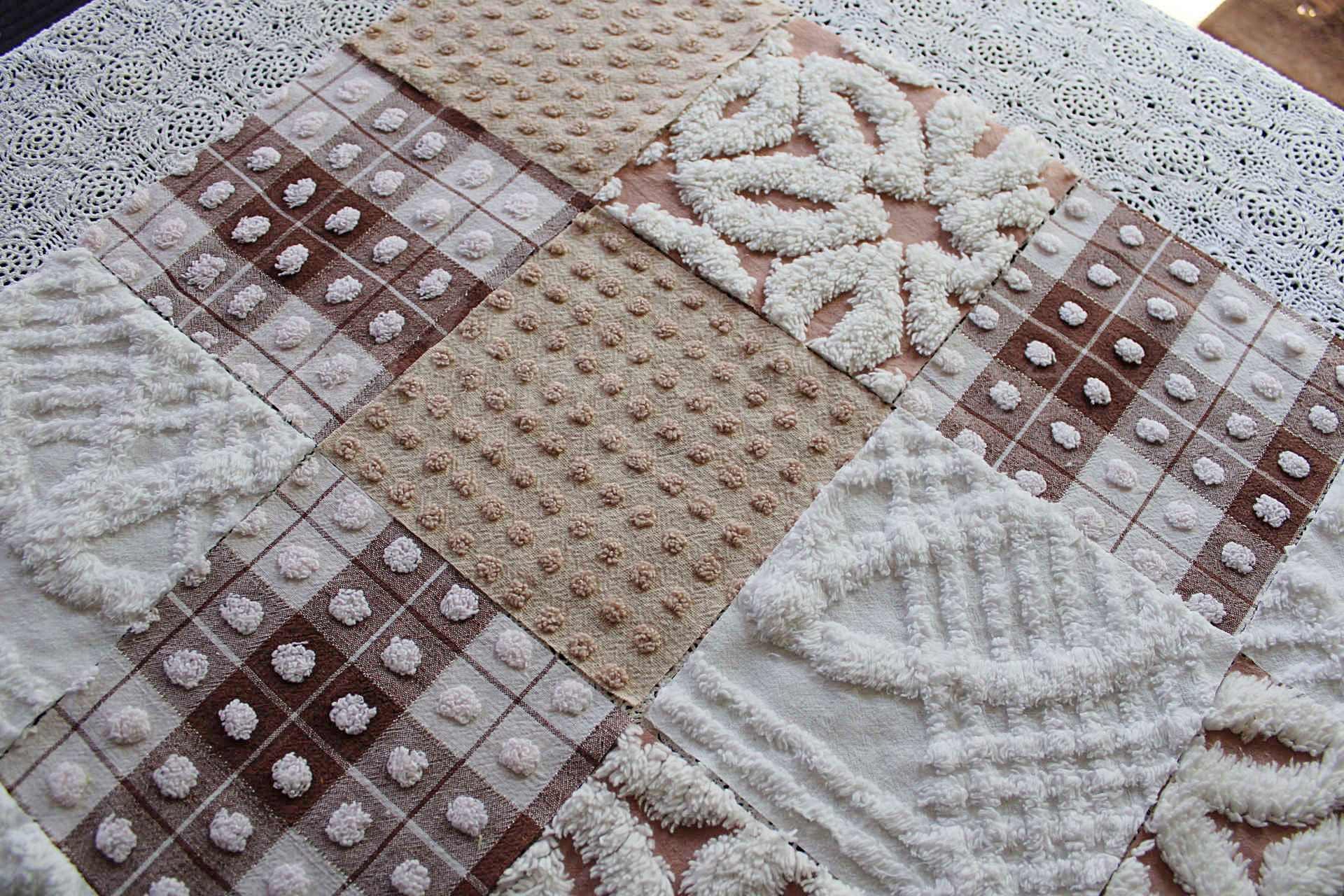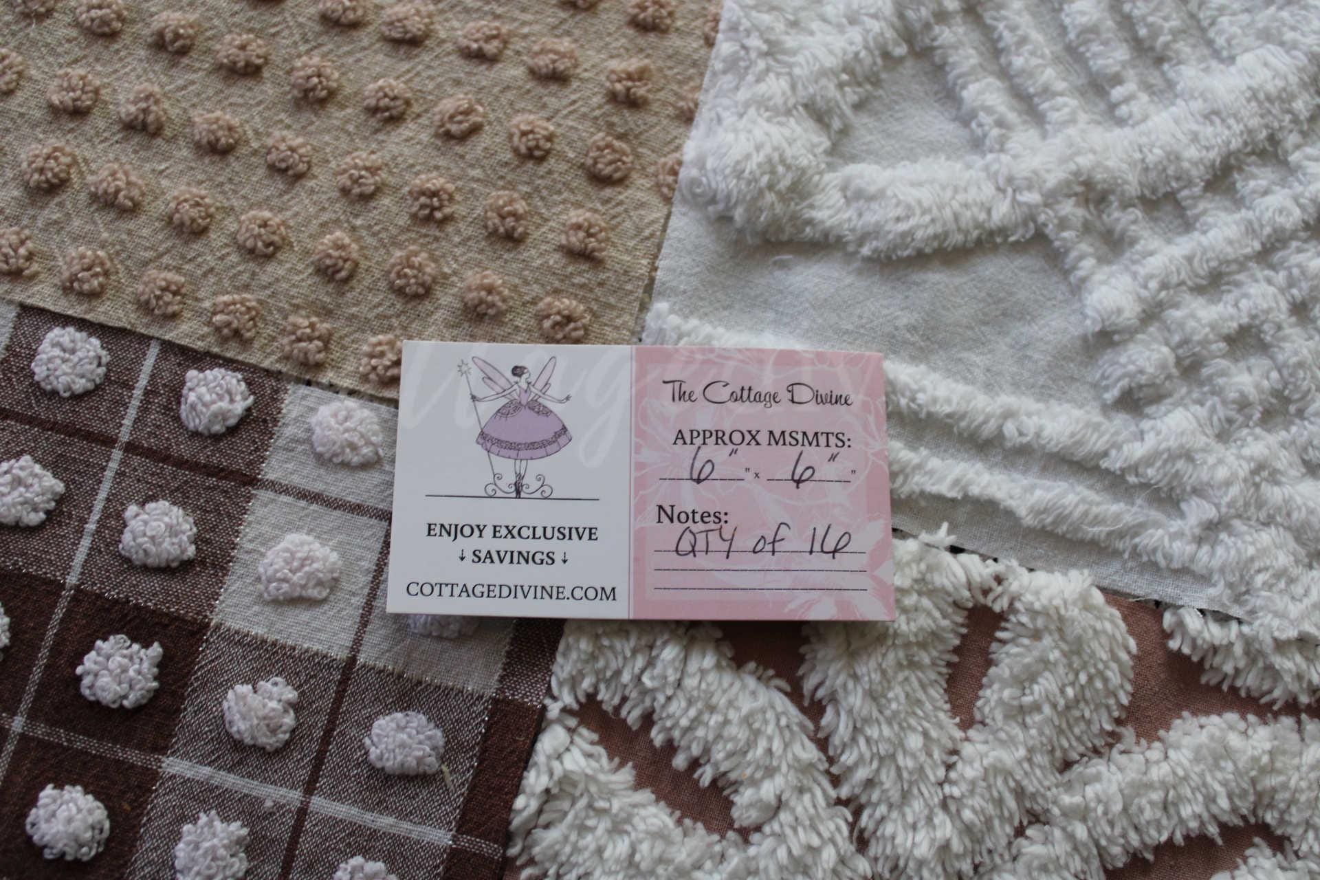"Bear Hugs" ... Warm, welcoming chocolaty & mocha tones blend well with soft white in this 16-block set of chenille quilt squares. Cute jumbo white daisy tuft squares contrast with micro dots to provide excellent textural interest.::total qty: 16 separate chenille quilt squares