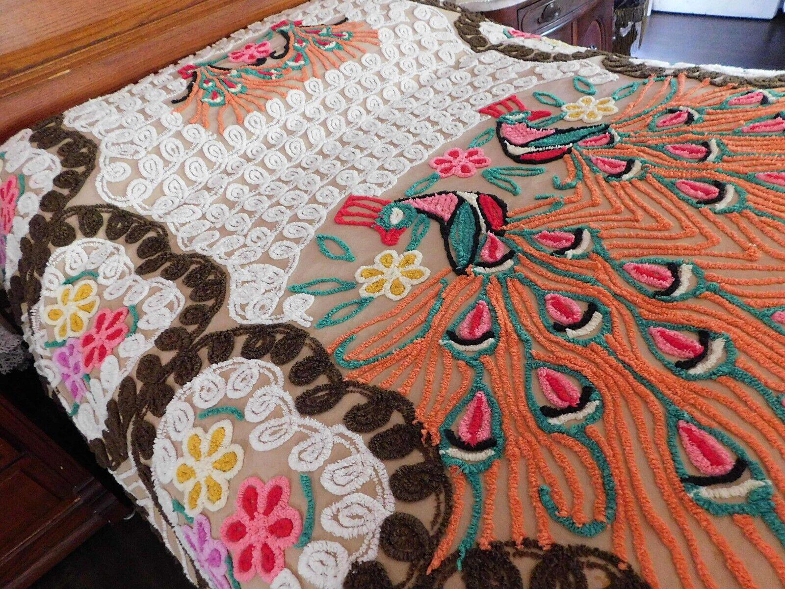 Boho fabulous FULL SIZE vintage peacock chenille bedspread with on-trend retro vibes - great milk chocolate color bkgd and plenty of exotic color. It's said opposites attract, and these lovebirds are here to prove it - each is situated opposite the other, in a rare colorway emphasizing orange tuftingThe peacocks are surrounded by prominent candybox style hearts with trios of rainbow flowers. At the pillow area, a small pair of baby peacocks are situated. Original chenille bedspread from the 1950s eraStandard Full/Double bed size. Photographed on a high Full bed. To see this bedspread staged on a Twin, Full or Queen bed, or if you'd like any specific photos, just let us know-FULL size; displayed in photos on a Full bed