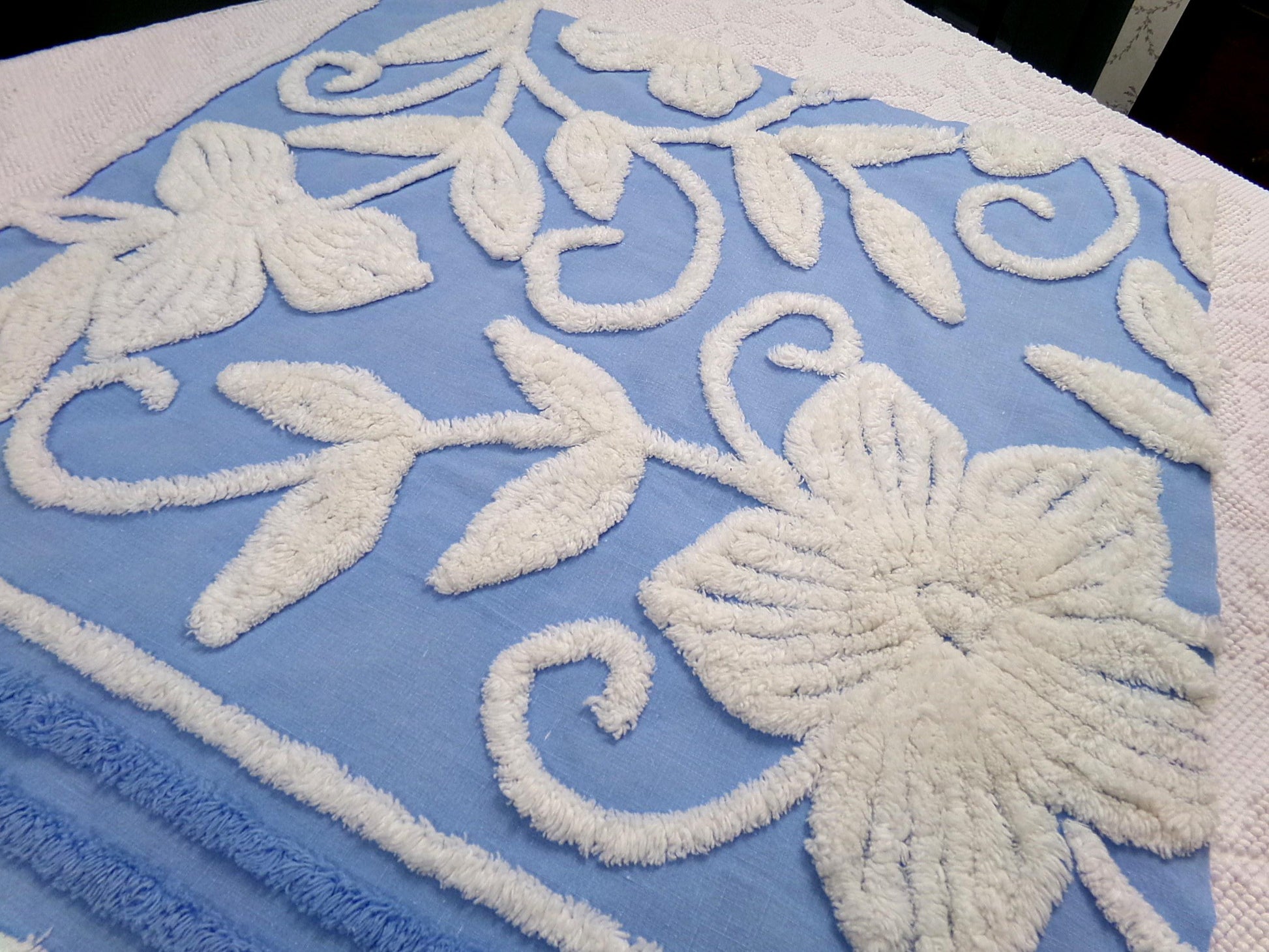 Gorgeous coastal chic piece of vintage chenille fabric in a plush white botanical floral print on a dreamy blue bkgd.Ideal for a decorative pillow, quilt inlay, or wall hanging. How will you upcycle this textile treasure from long ago?