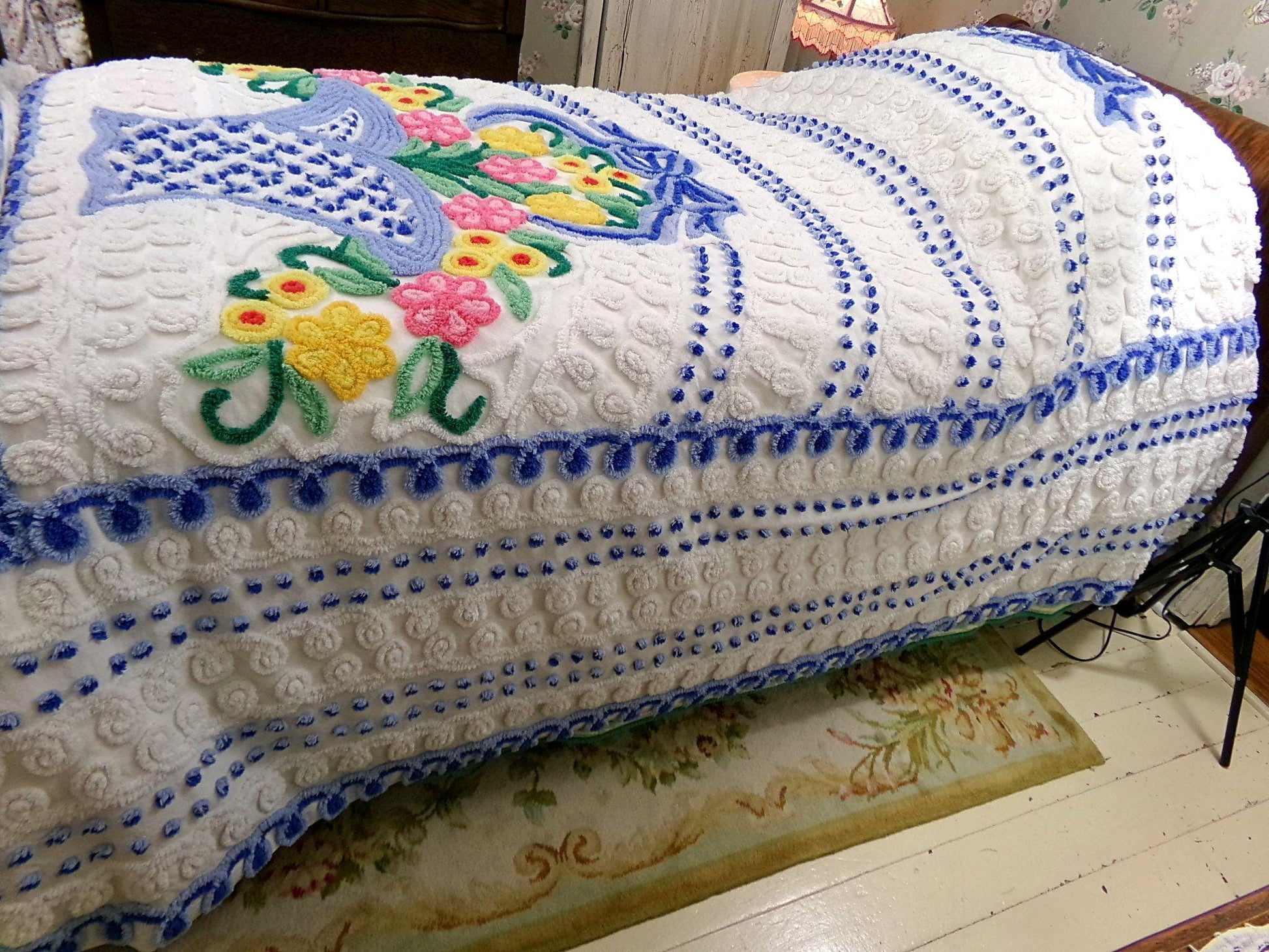 This vintage, full size chenille bedspread is sure to bring some joy into your home with its colorful design. I think of it as the retro 1950s version of cottage charm :) It's overflowing with joy - brightly colored flowers spill out of a large flower basket design.A sweet bow motif rests at the pillow tuck area, and variegated blue "sprinkle" pops dance across white swirls of chenille. Rounded bottom corners; 100% cotton in a nice medium weight.