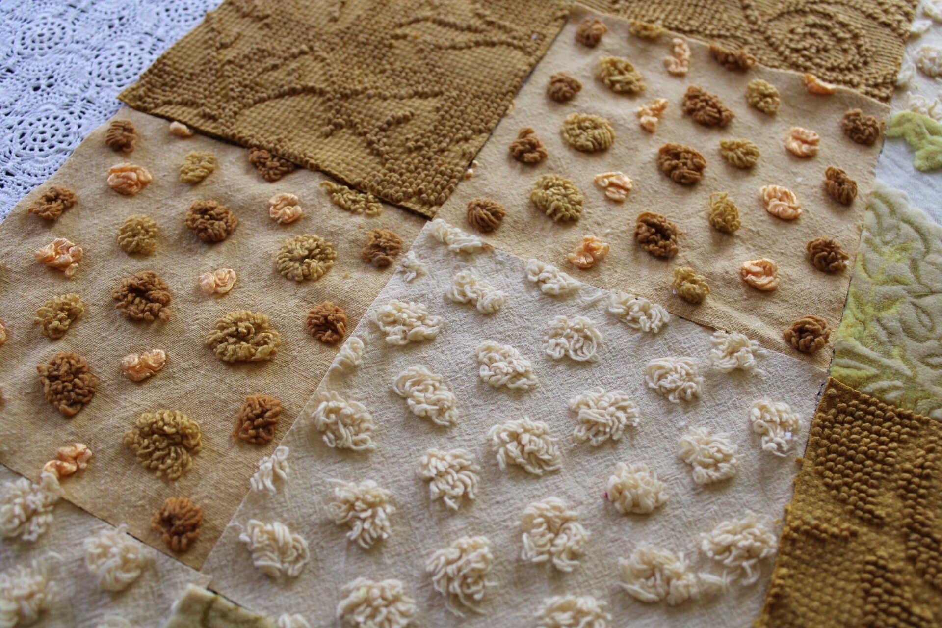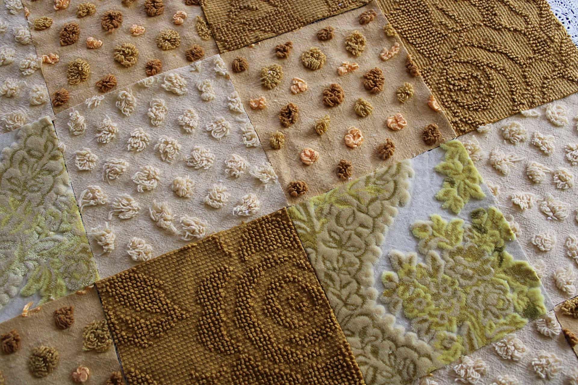 "Hippie Mama" ... Travel back to the retro goodness of long ago with this hippie-themed 16-block set of chenille & velvet quilt squares. Striking luxury Bates cut velvet contrasts with golden puff dots & earthy coppertone pops.::total qty: 16 separate chenille quilt squares