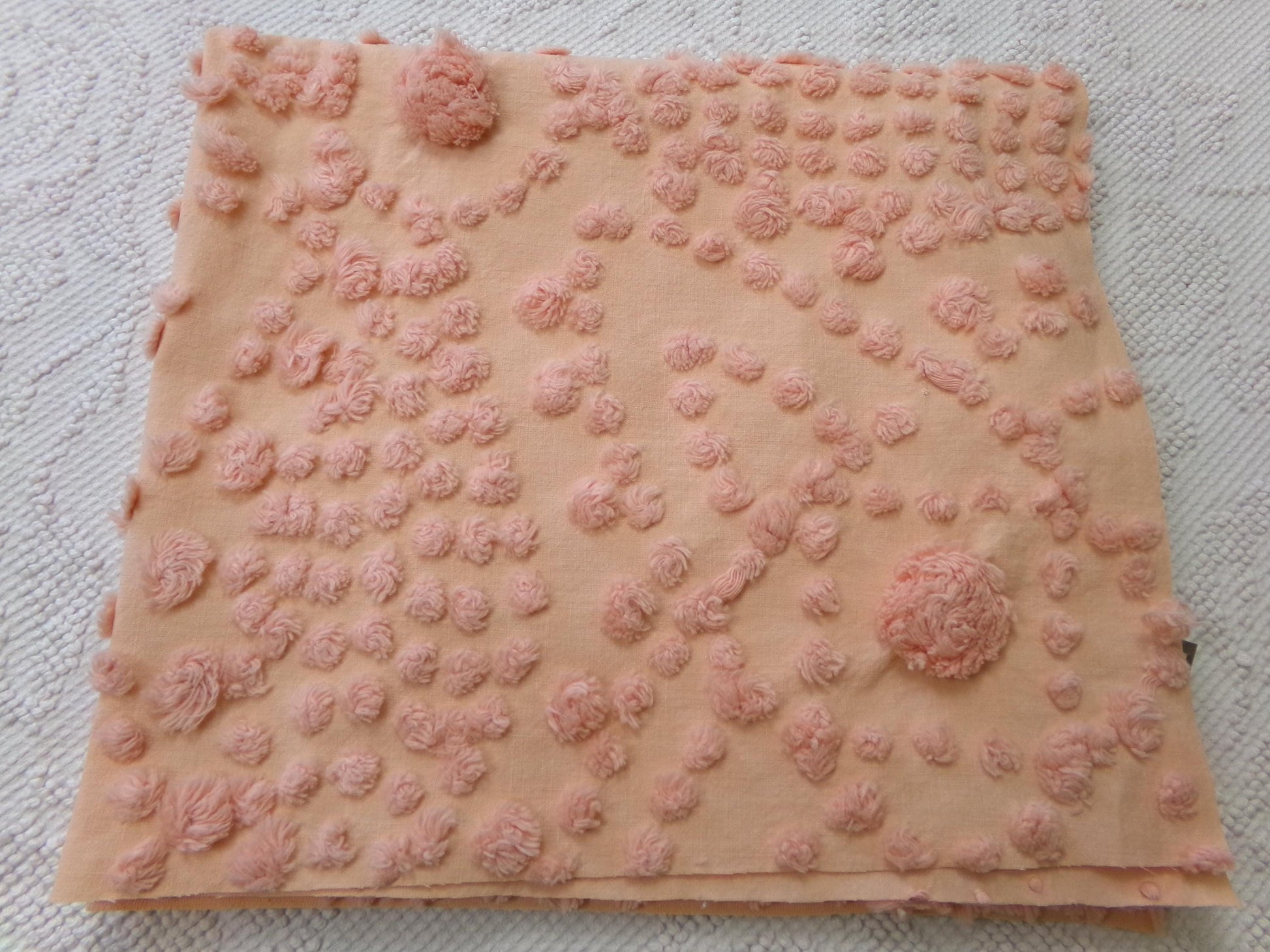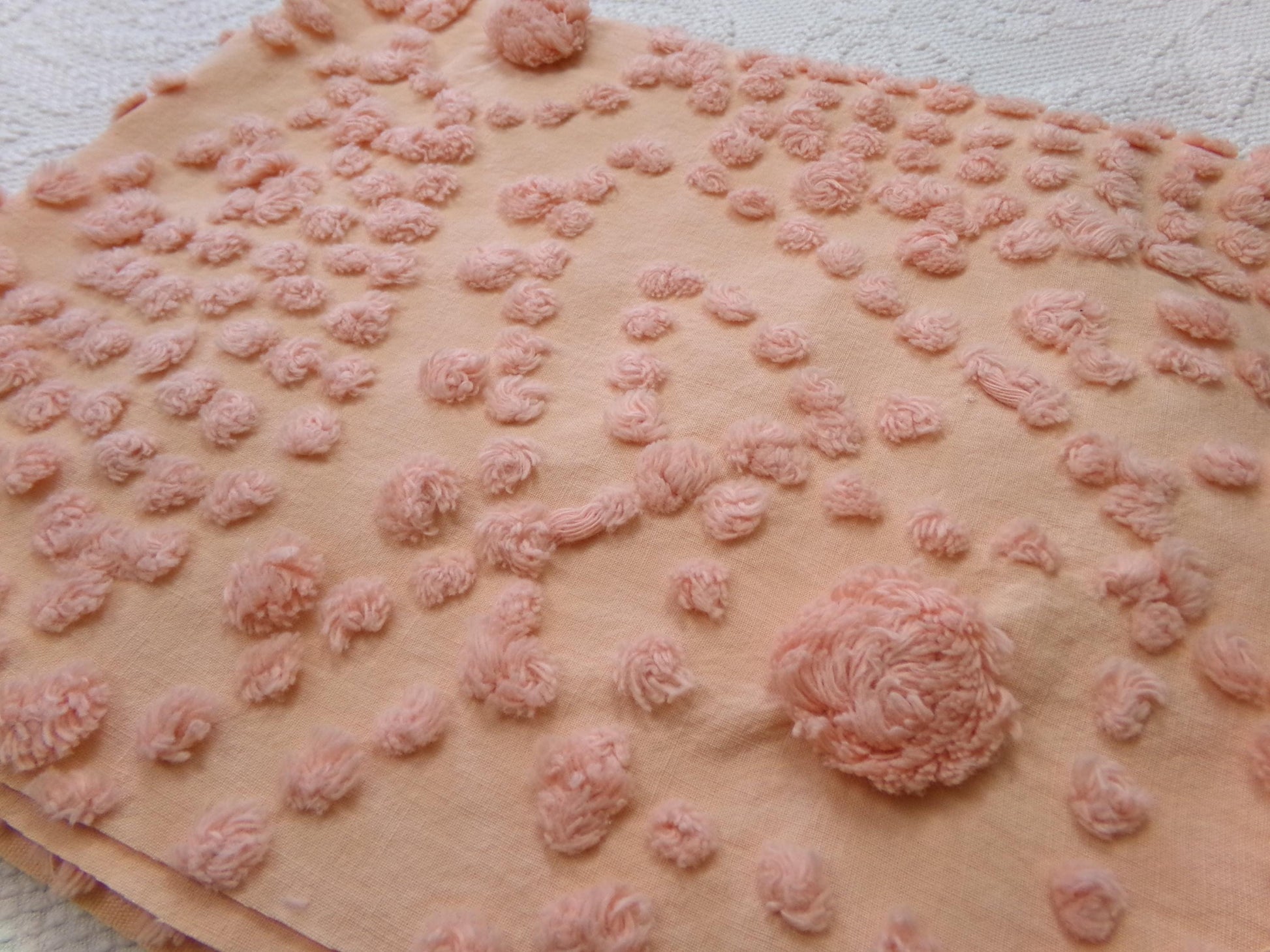 With intricate shining sun designs set on a calming peach, this piece of vintage chenille fabric is sure to bring a divine radiance to your project. It adapts to light well, as seen in the photos. Lends a gorgeous, nostalgic essence in quilts & pillows. ☀️key highlights: