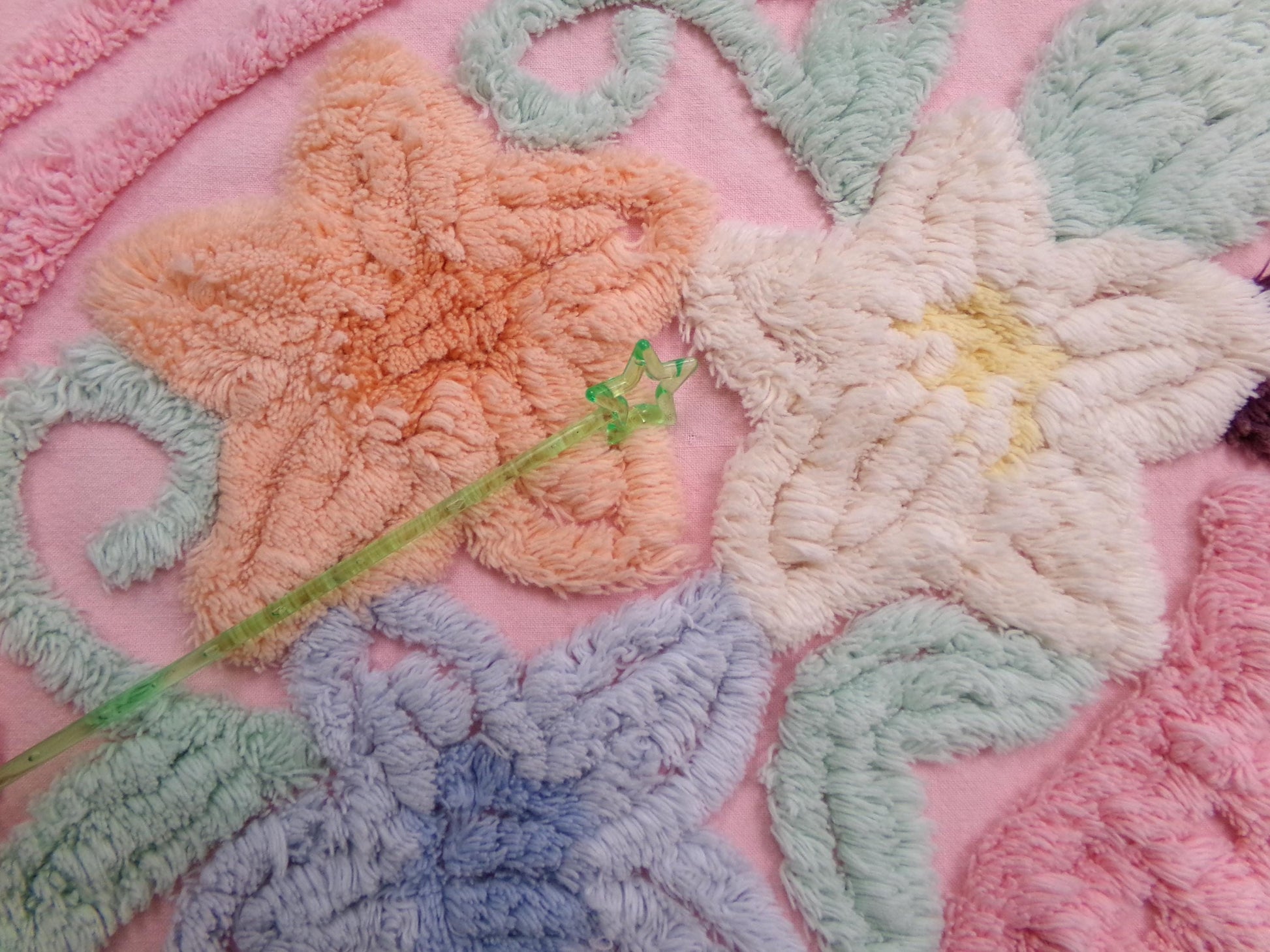 Vintage chenille fabric piece in mauve florals, 17" x 23"Romantic vintage mauve pink chenille fabric featuring shabby cottage floral motifs surrounded by raised swirl tufts. The burgundy tufting has some great patina with lightened areas as seen in img #3. This authentic 40s era textile is perfect for quilting, upcycle projects, pillow covers, or any cottage chic craft creation.