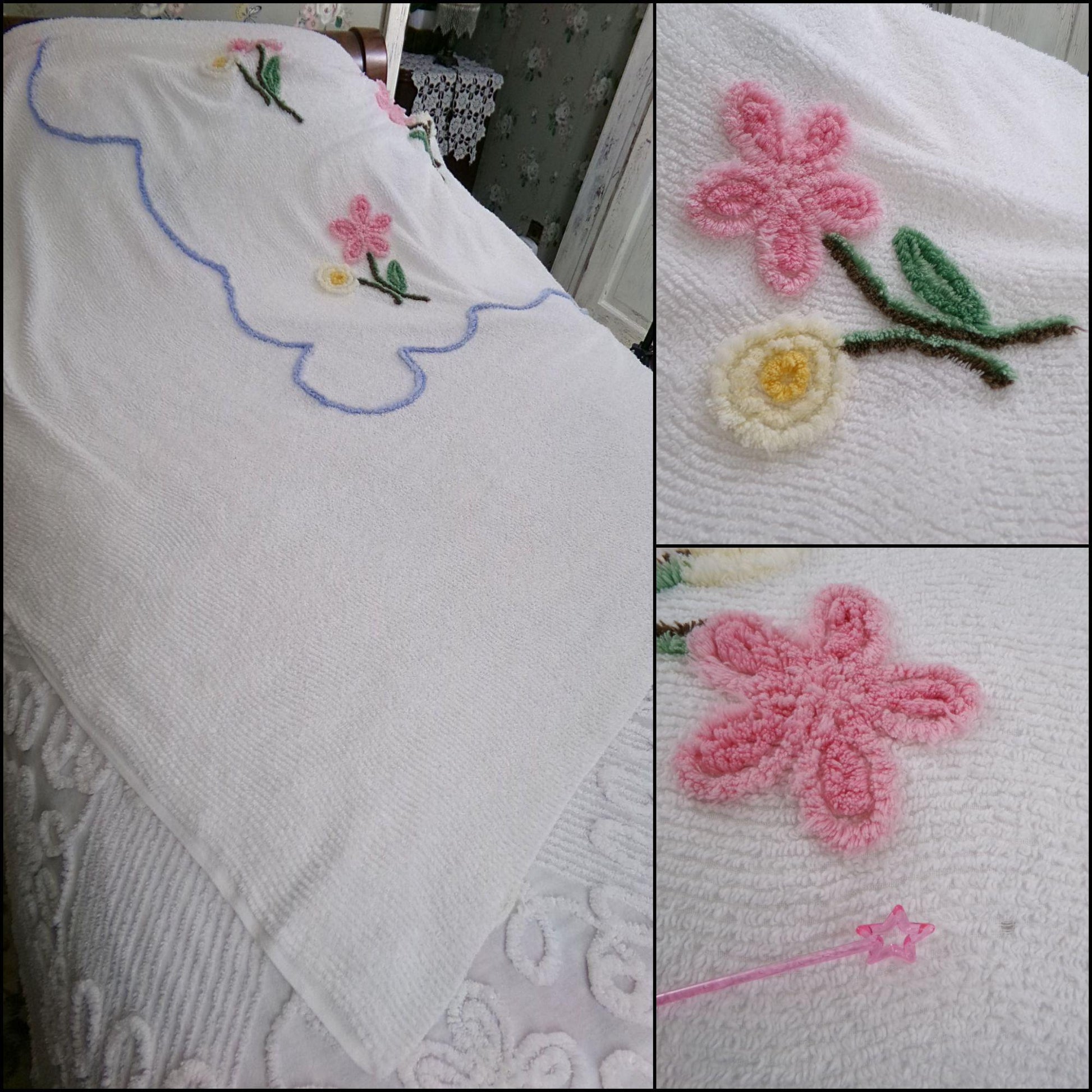 Perfect for summer months or warmer climates, this is a lovely very lightweight chenille bedspread in a scattered falling floral pattern that can be displayed with the flower bouquets facing up or down, as I have shown. Tufted pink flowers dance against a soft white background, accented with a simple blue ripple line along the three drop sides. A great coverlet to layer with coordinating linens for a cottage style look.Full size. Approx 87"W x 100"L. 100% soft, lightweight cotton. Shown on a twin bed in a brightly lit room; to see this bedspread staged on a queen or full size bed, reach out anytime.