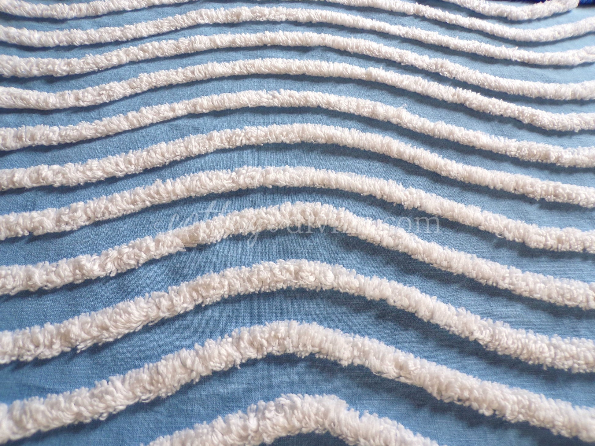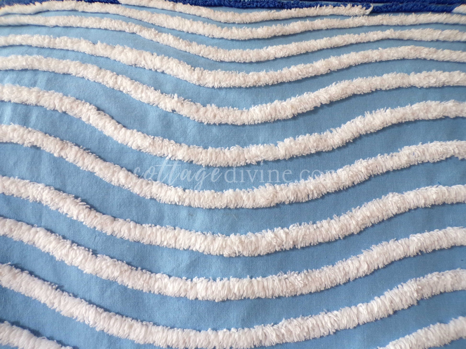 Add an essence of the ocean into your project with this 26" x 16.5" inch chenille fabric piece. Sourced from an authentic, original vintage chenille bedspread, the fabric features a wideset tufted white wave pattern on serene blue.100% cotton; 1950s era. Small fabric separation towards edge; see final imgw h a t - t o - k n o w
