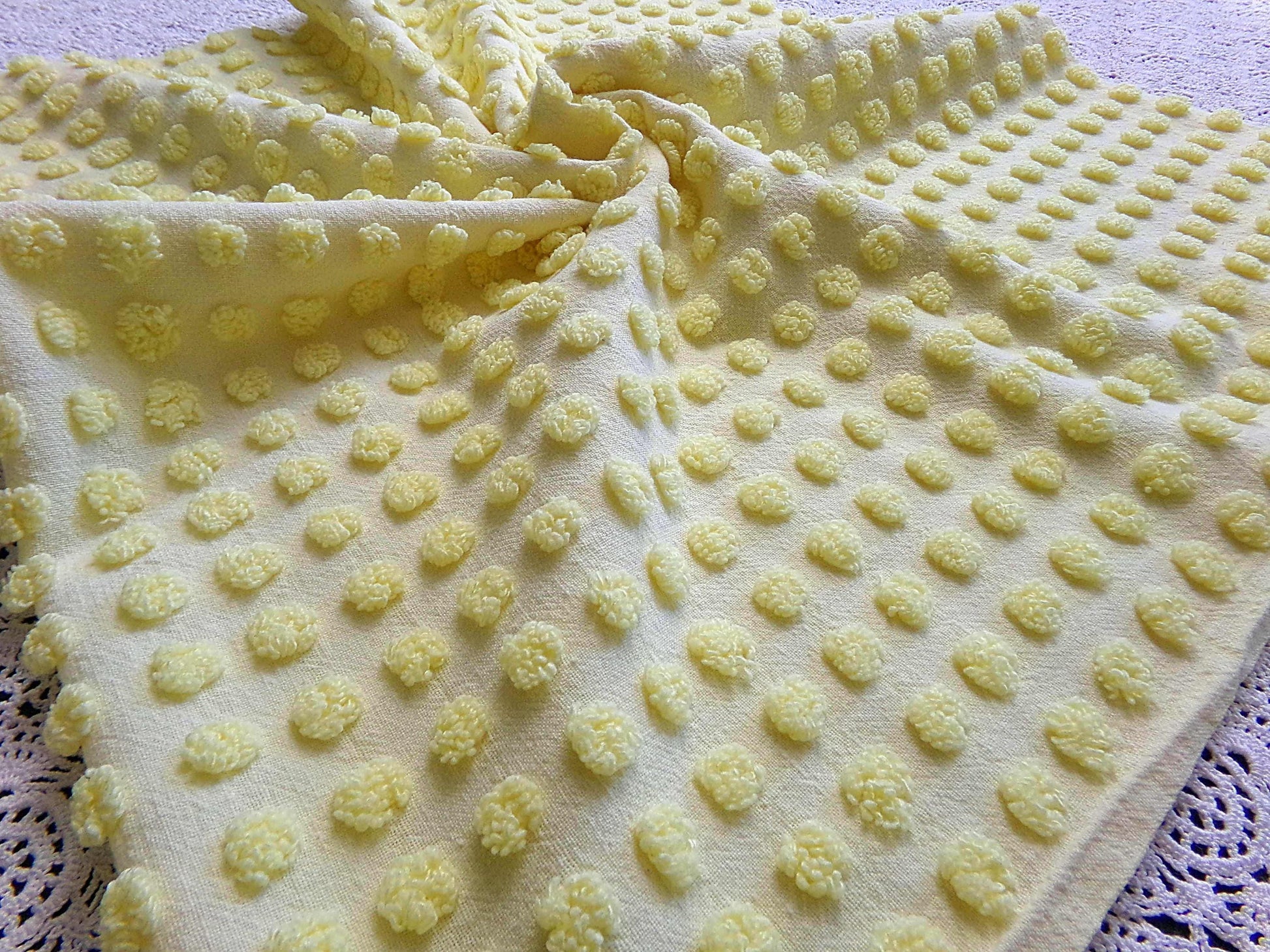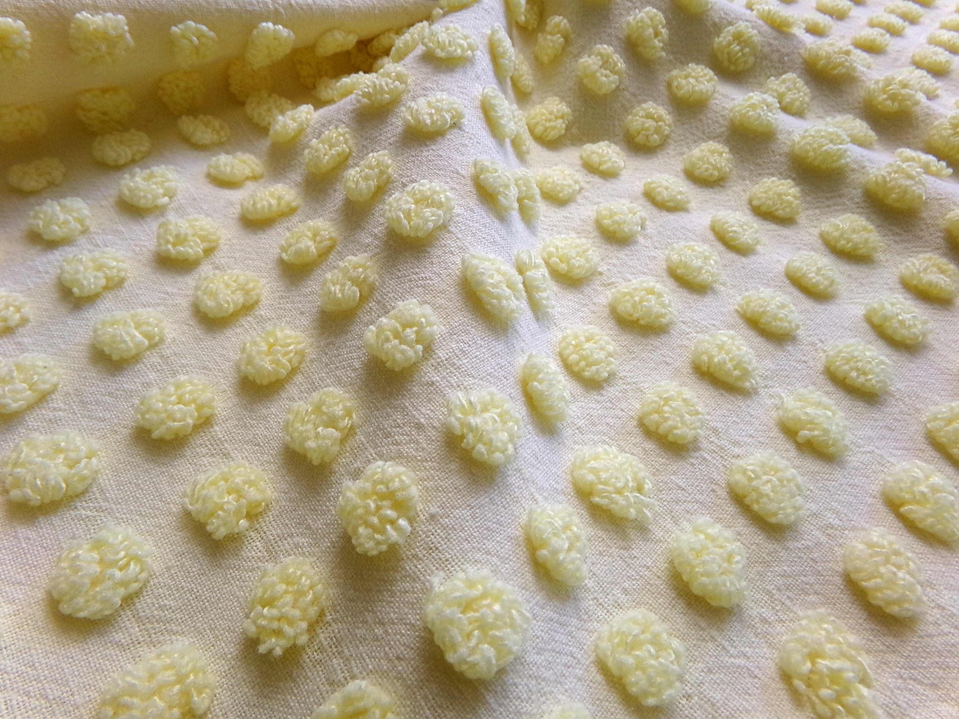 Delightfully cheerful vintage chenille fabric in a simple, uplifting nubby pops design. This material features a great shade of yellow - it's not too bold or overpowering, so it should incorporate well in a variety of design concepts.Lightweight, strong cotton blend with chenille popcorn tufting. Measures about 18" x 34" inches.