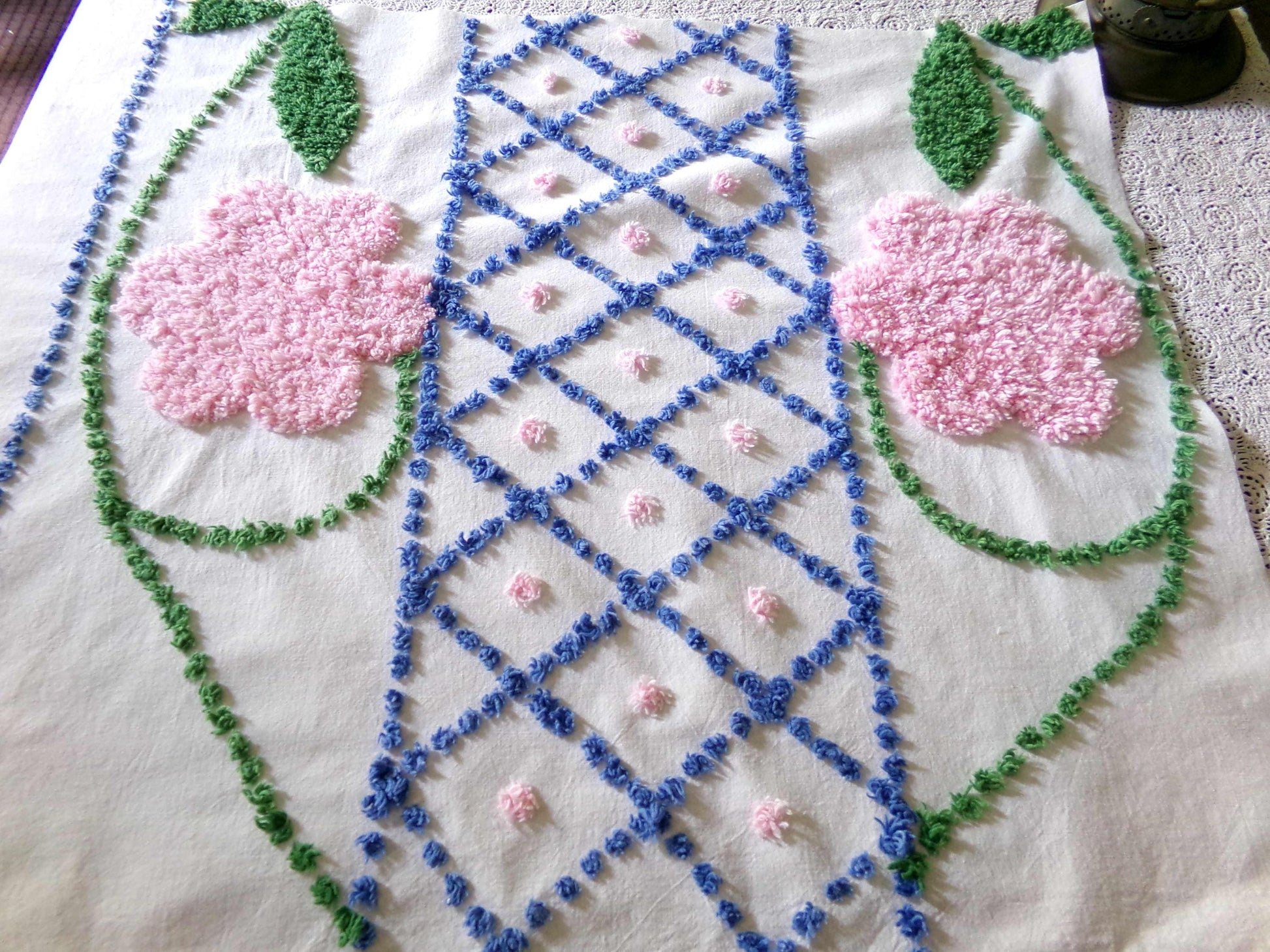 Imagine the amount of time it took someone to make this beautiful piece of fabric...swooping green leaf designs highlight a pair of giant pink tufted flowers. Separated by a contrast diamond dot design in frosty pink puffs with frosted royal blue tufting.Fabric piece measures 22" x 33" inches. 100% lightweight vintage/antique cotton, handtufted. Shabby Victorian style coordinating fringe along an edge.
