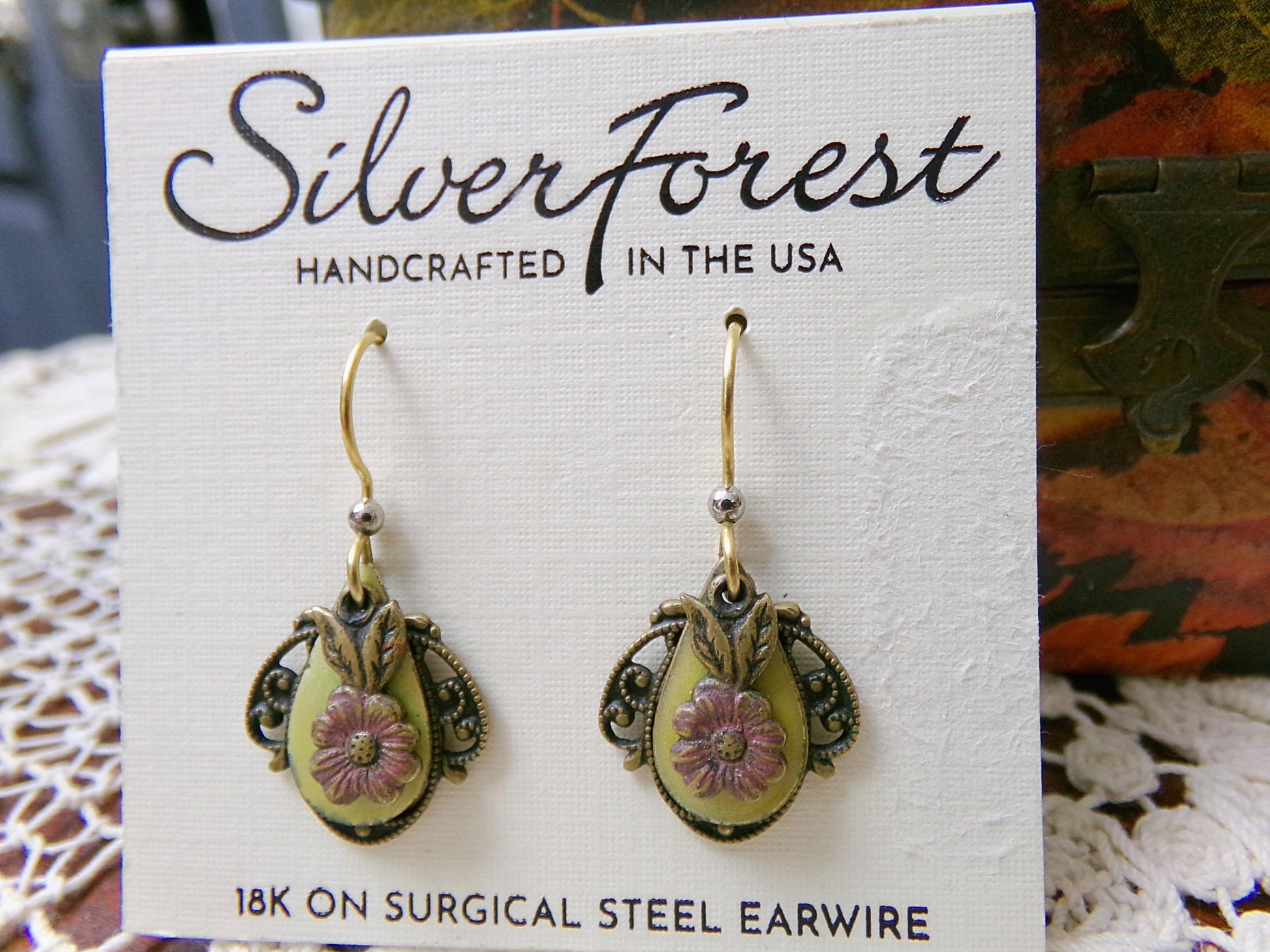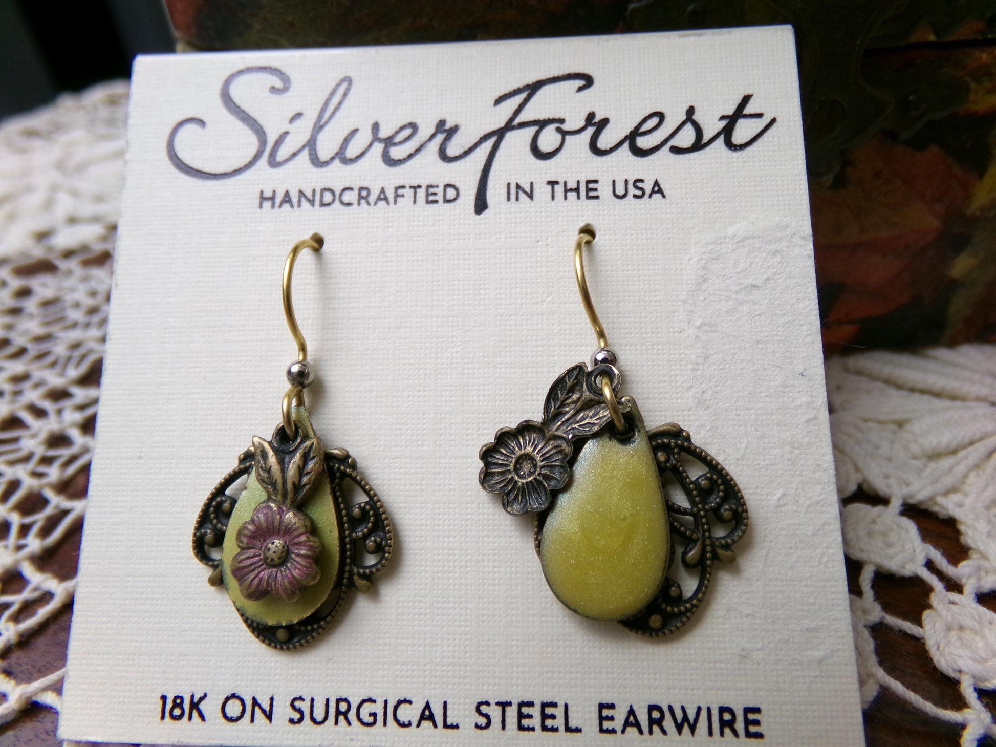 Feminine pair of Silver Forest brand dangle pierced earrings with a layered design. A single pink flower pops against a chartreuse green enamel type bkgd.Pre-loved condition. Natural vintage attributes with some nice light patina/wear.