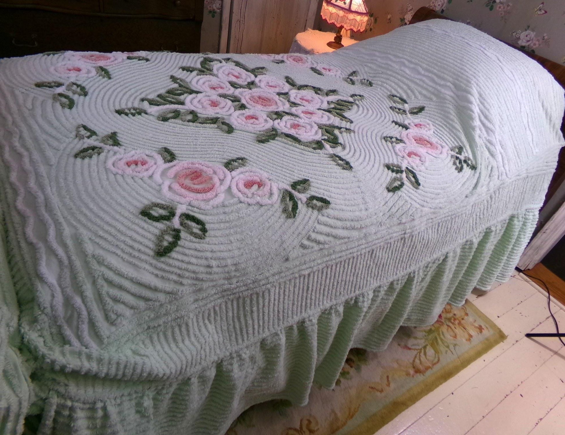 Envision drifting off to sleep under this dreamy chenille bedspread. If you're going for a romantic vintage look, this beautiful bedspread will achieve your visions...features a showy display of tufted cottage roses on a soft, pastel mint green. Softer, 1960s era cotton blend so this bedspread has a nicer texture than earlier, stiffer cottons of the 40s & 50s era.Intended for a standard full bed, this bedspread features a boxed, fitted design intended to "hug" the mattress tightly, split bottom corners in case you have a 4-poster bed, and factory cutouts at each side of the top corner area. Integrated softly gathered skirt.