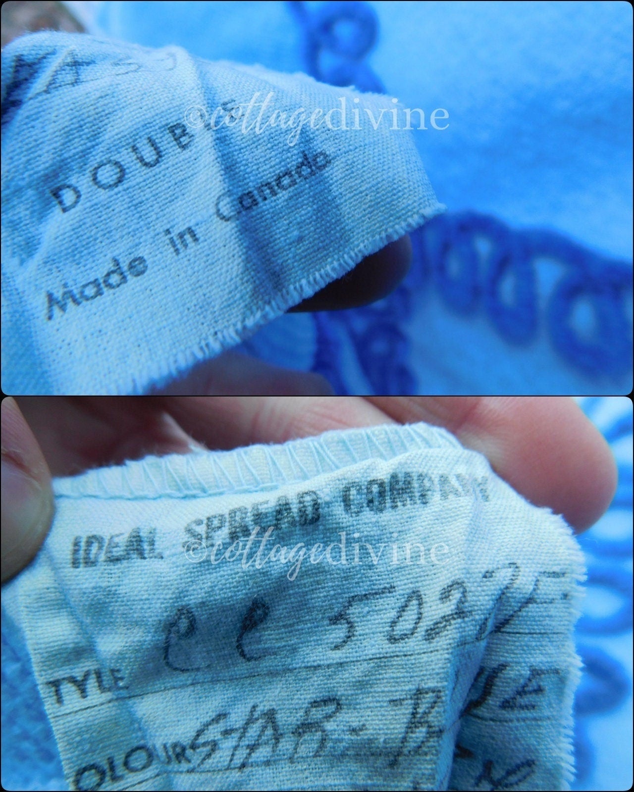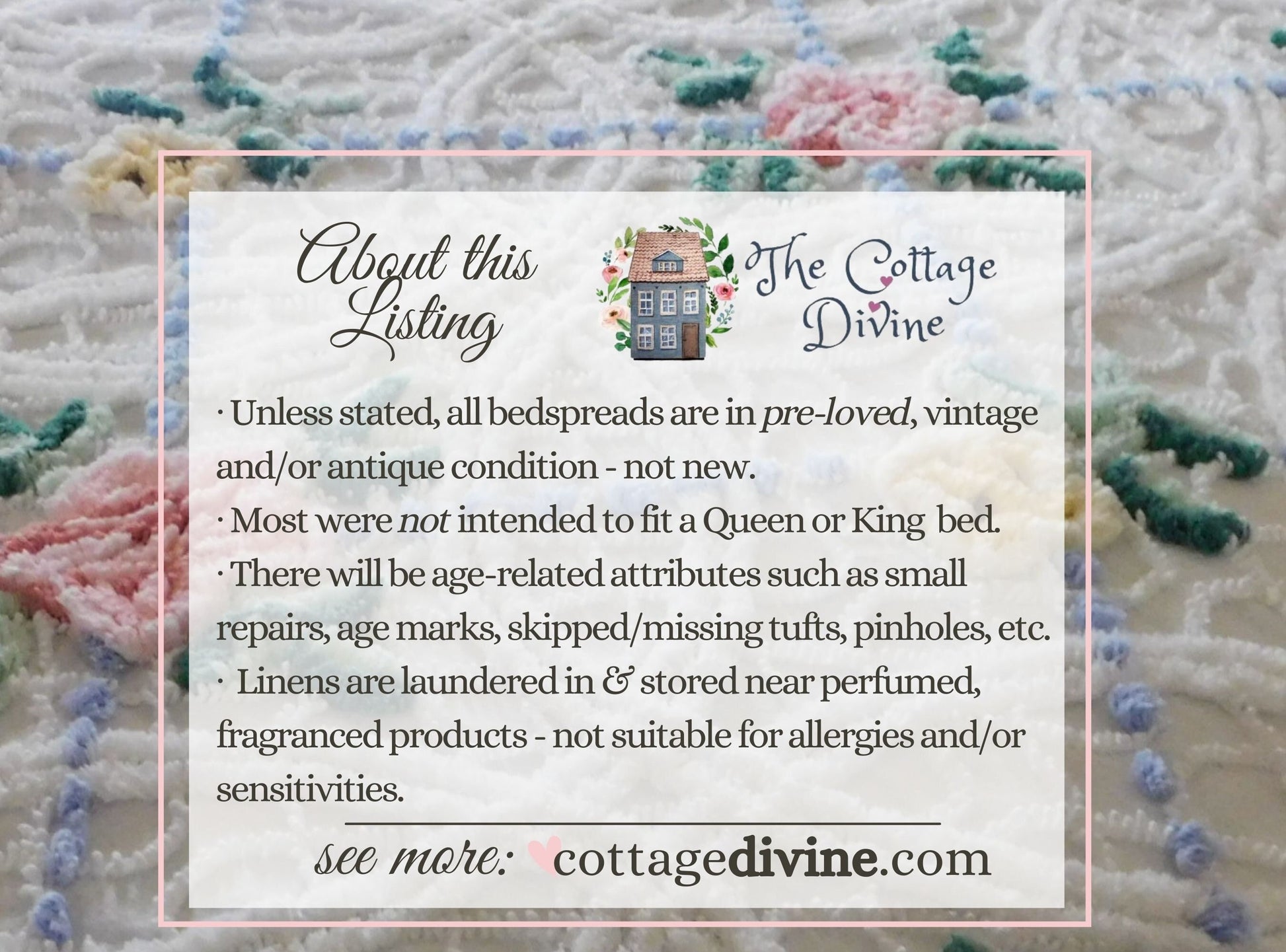 {FULL SIZE} What a special vintage chenille bedspread - this one is by the Canada-made "Ideal Spread Company" with its original cloth tag (with factory writing!) still affixed.Serene deep midnight blue curlicues form diamonds around single lemon yellow and watermelon pink-red flowers. Set on a lightweight, very soft groundcloth in a serene lake blue. Just a beauty..- FULL size as tagged/approx msmts: 90"W x 102"L