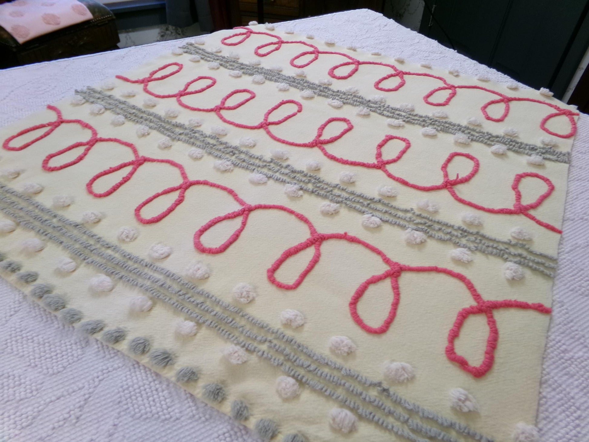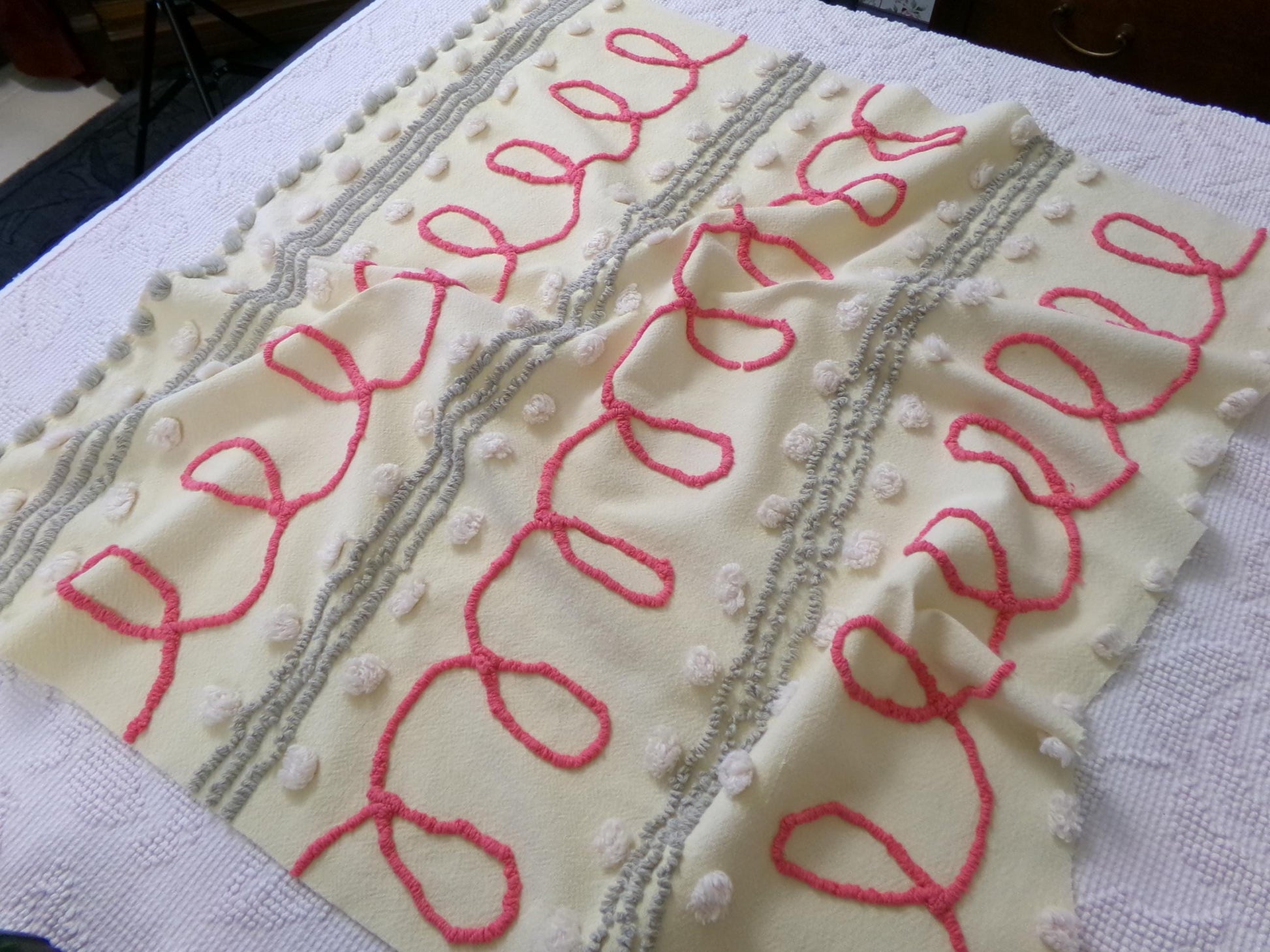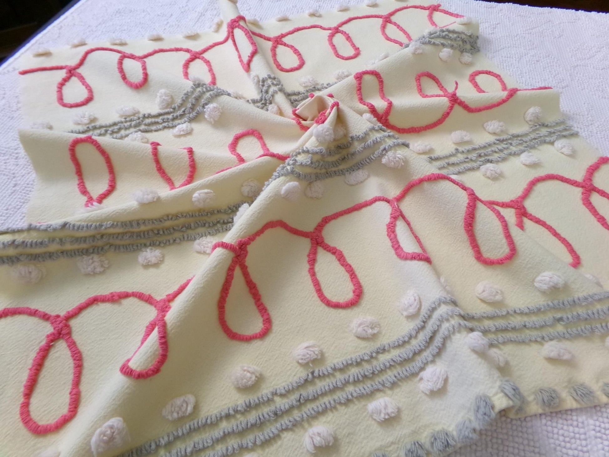 Looking for some very unique vintage chenille fabric? You found it.This sewing material features a fascinating red looping doodle design, accented by rows of grey lines & white dots. Set on a light, cool yellow bkgd with natural color variations. How does it inspire your creativity?