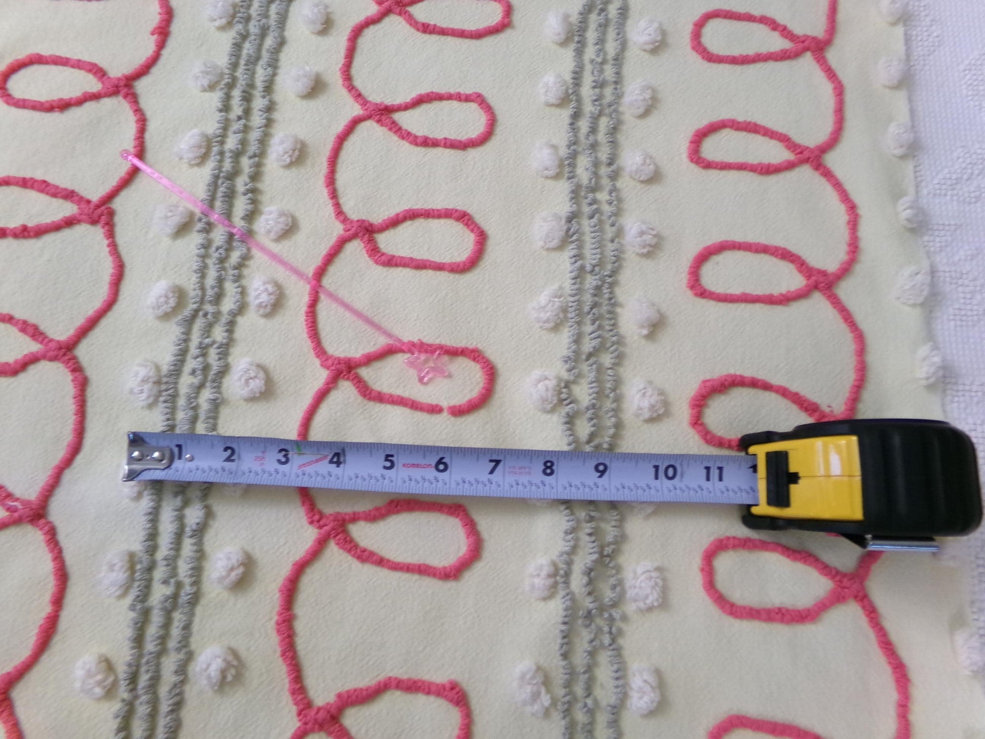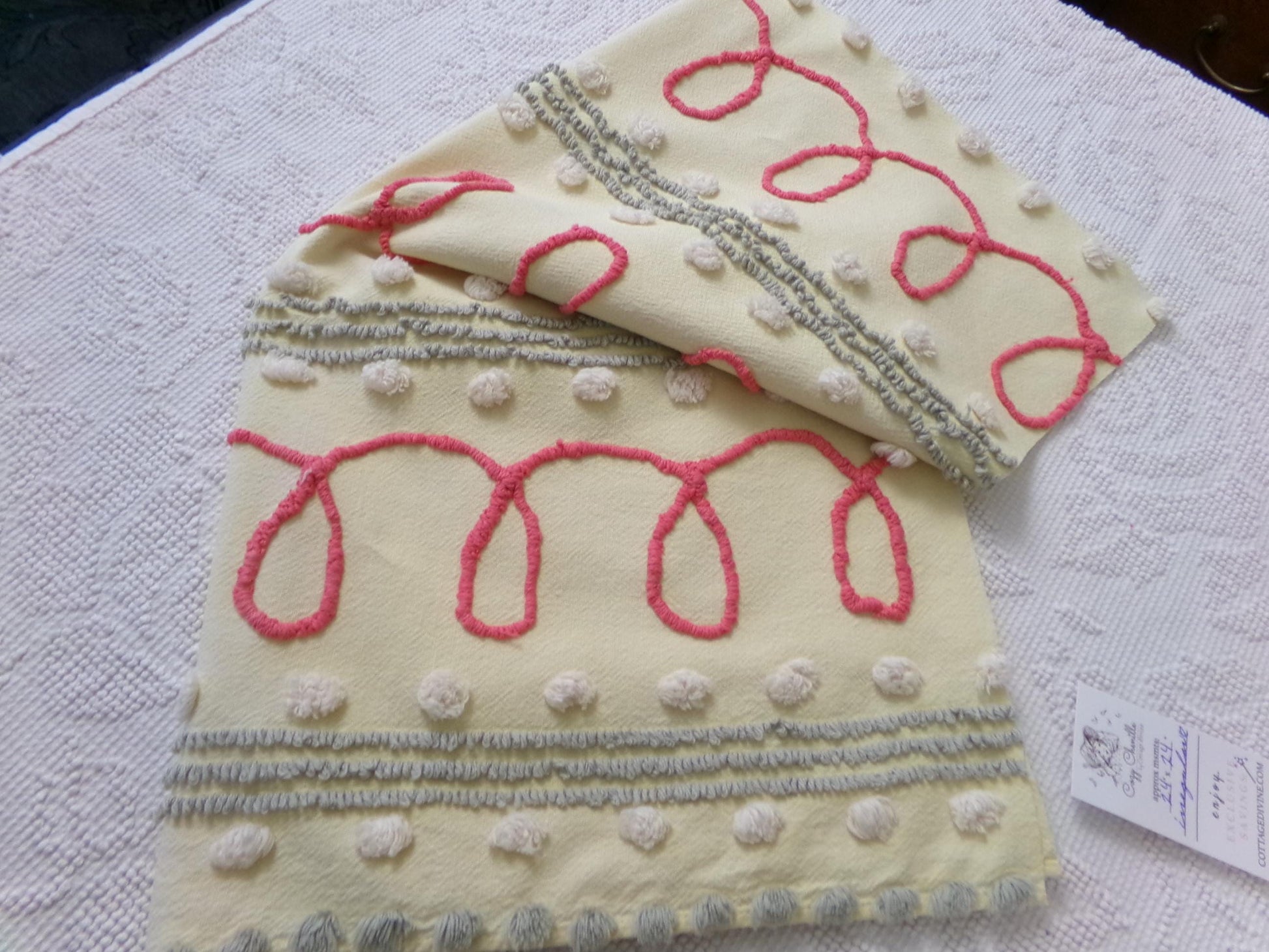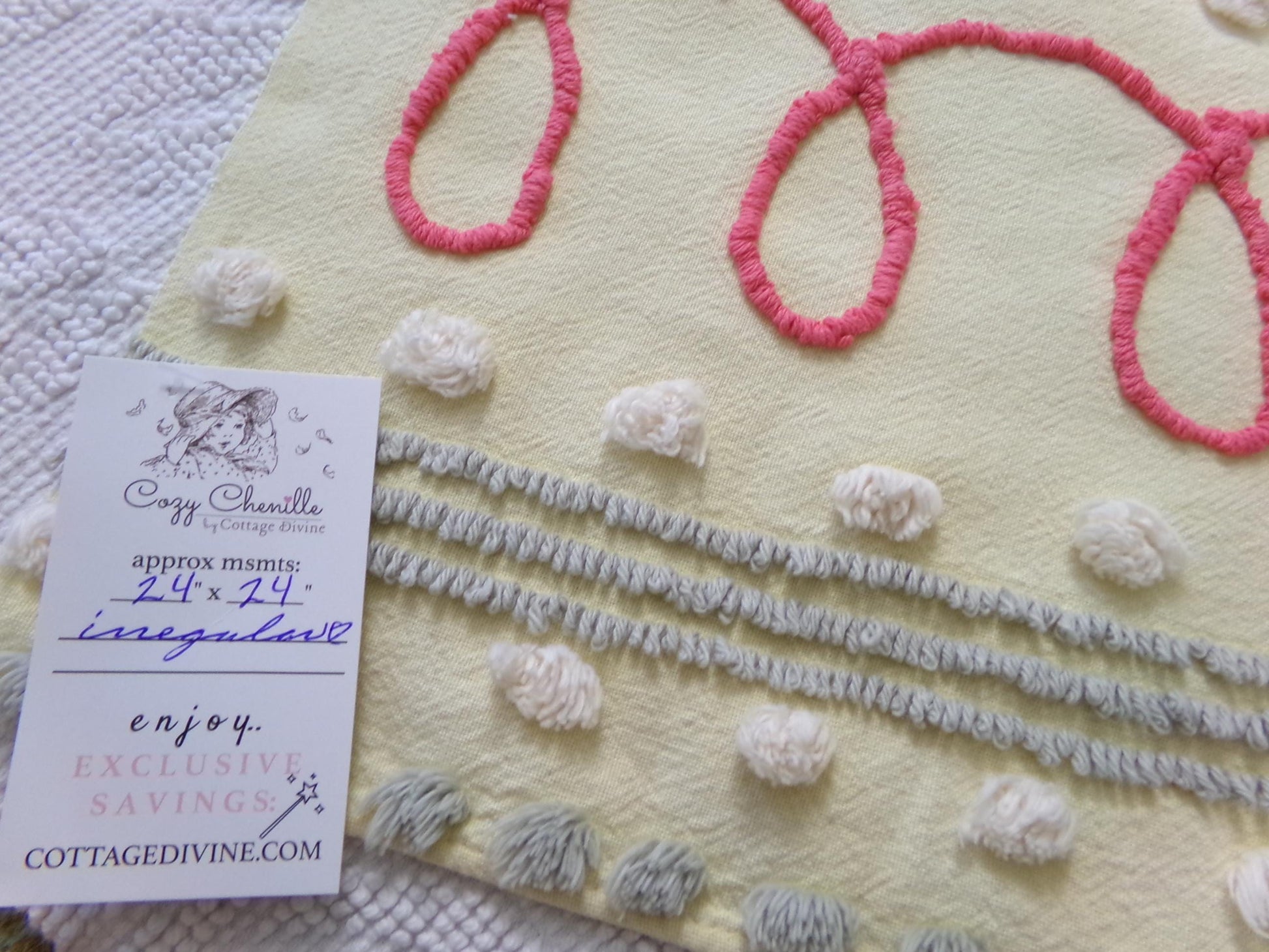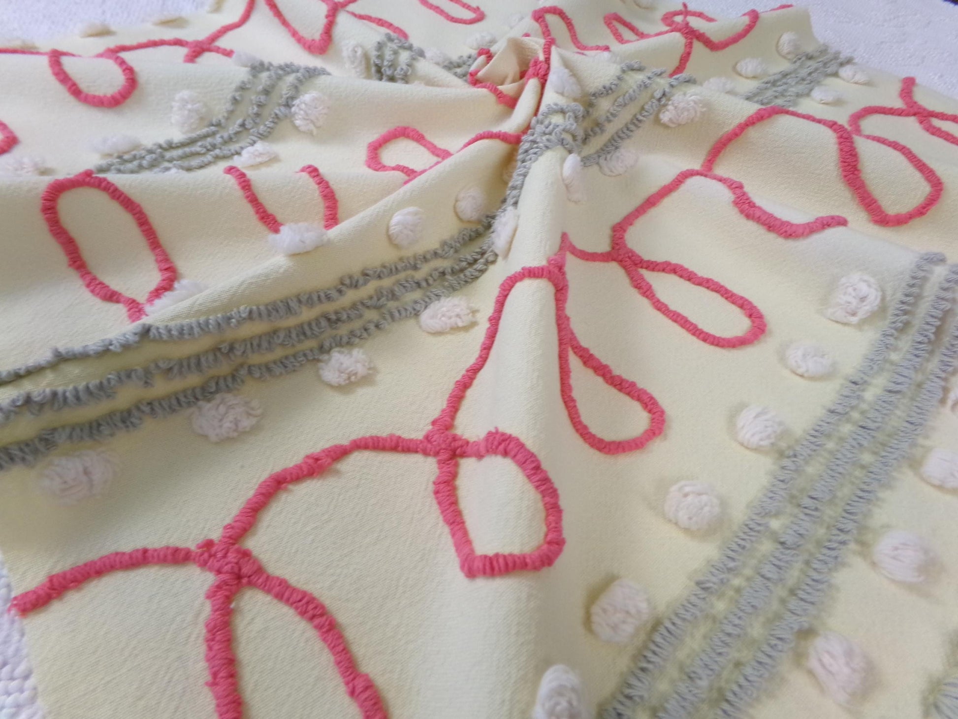 Looking for some very unique vintage chenille fabric? You found it.This sewing material features a fascinating red looping doodle design, accented by rows of grey lines & white dots. Set on a light, cool yellow bkgd with natural color variations. How does it inspire your creativity?