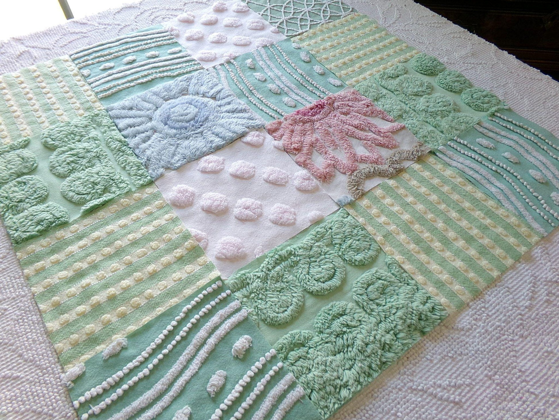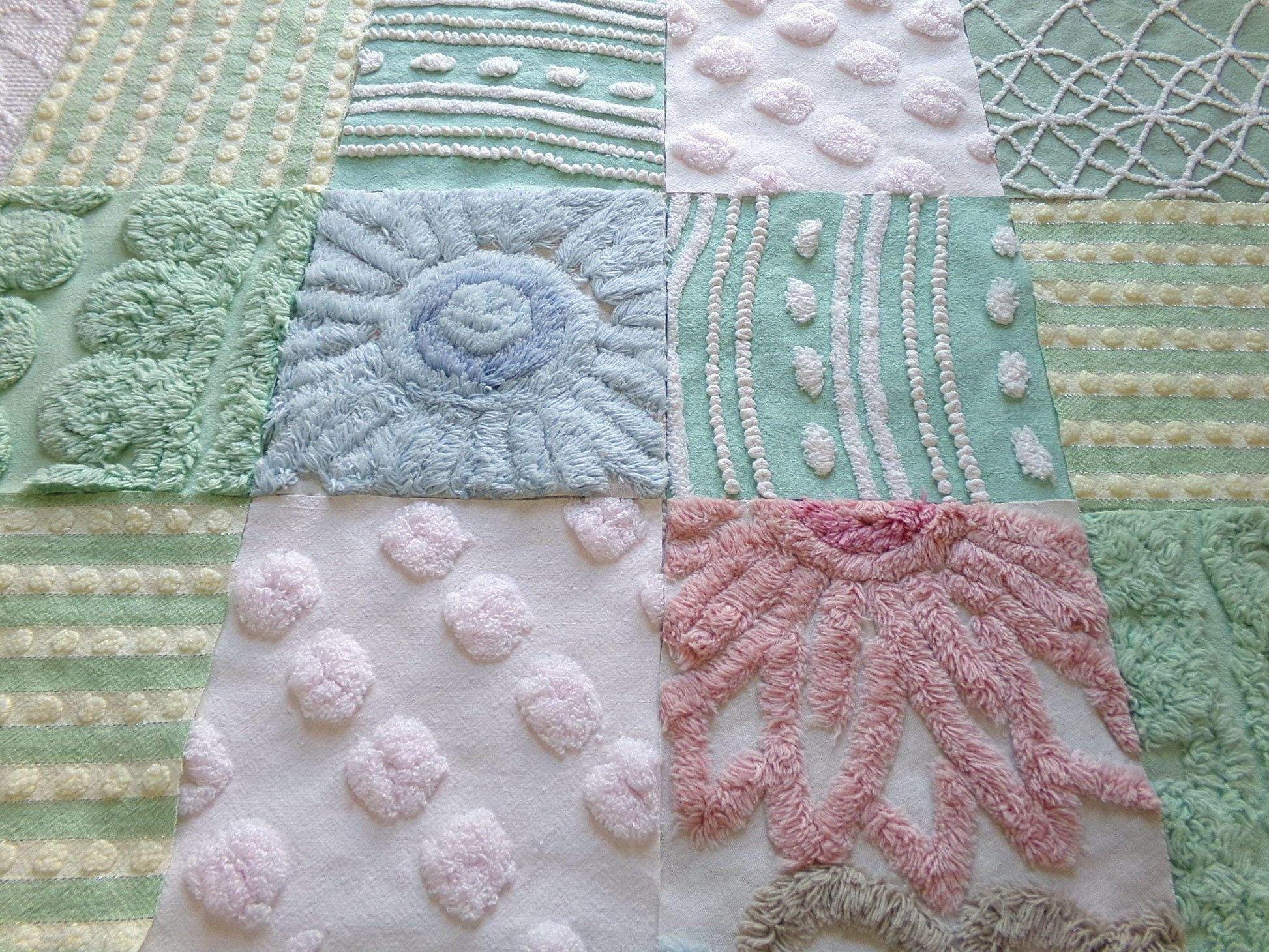 This assorted premium mix of fabric squares has been rotary cut by hand from original vintage chenille bedspreads. All are cotton or cotton blend. Ideal in DIY pillows & handmade quilts.