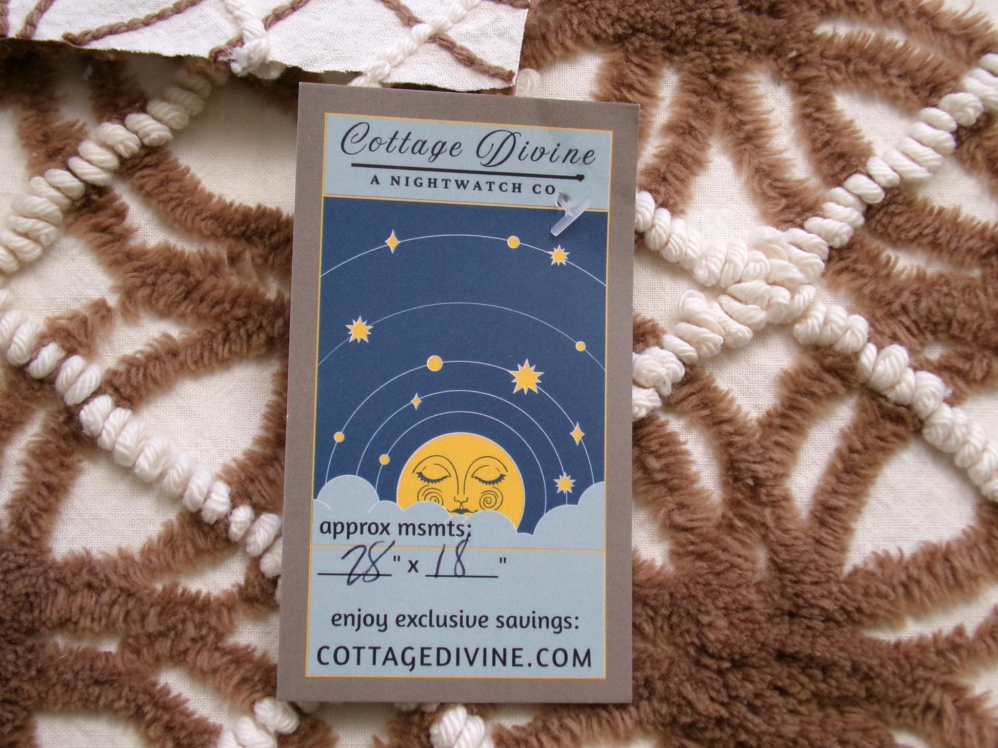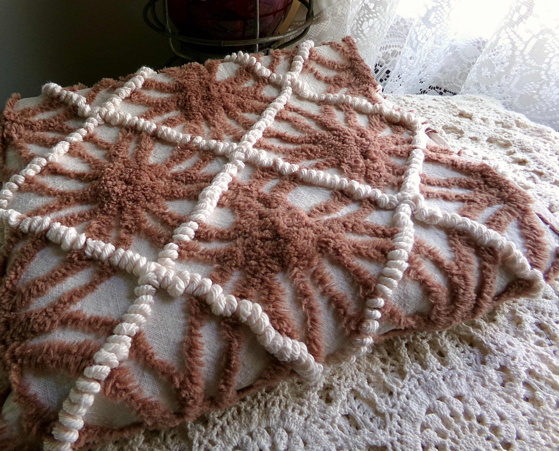 Need a bear hug? This vintage chenille fabric might help! So adorable, the piece features a needletuft wedding ring design in chocolate brown, mocha & vanilla tones, contrasting with skinny striped lines. So cute in stuffed animals, or upcycle into a DIY pillow or quilt, where it lends a grounding cozy presence.Measures about 28" x 18" inches. 100% cotton. Common to the age, there are a few age marks & skipped needletufting; sample shown final img.