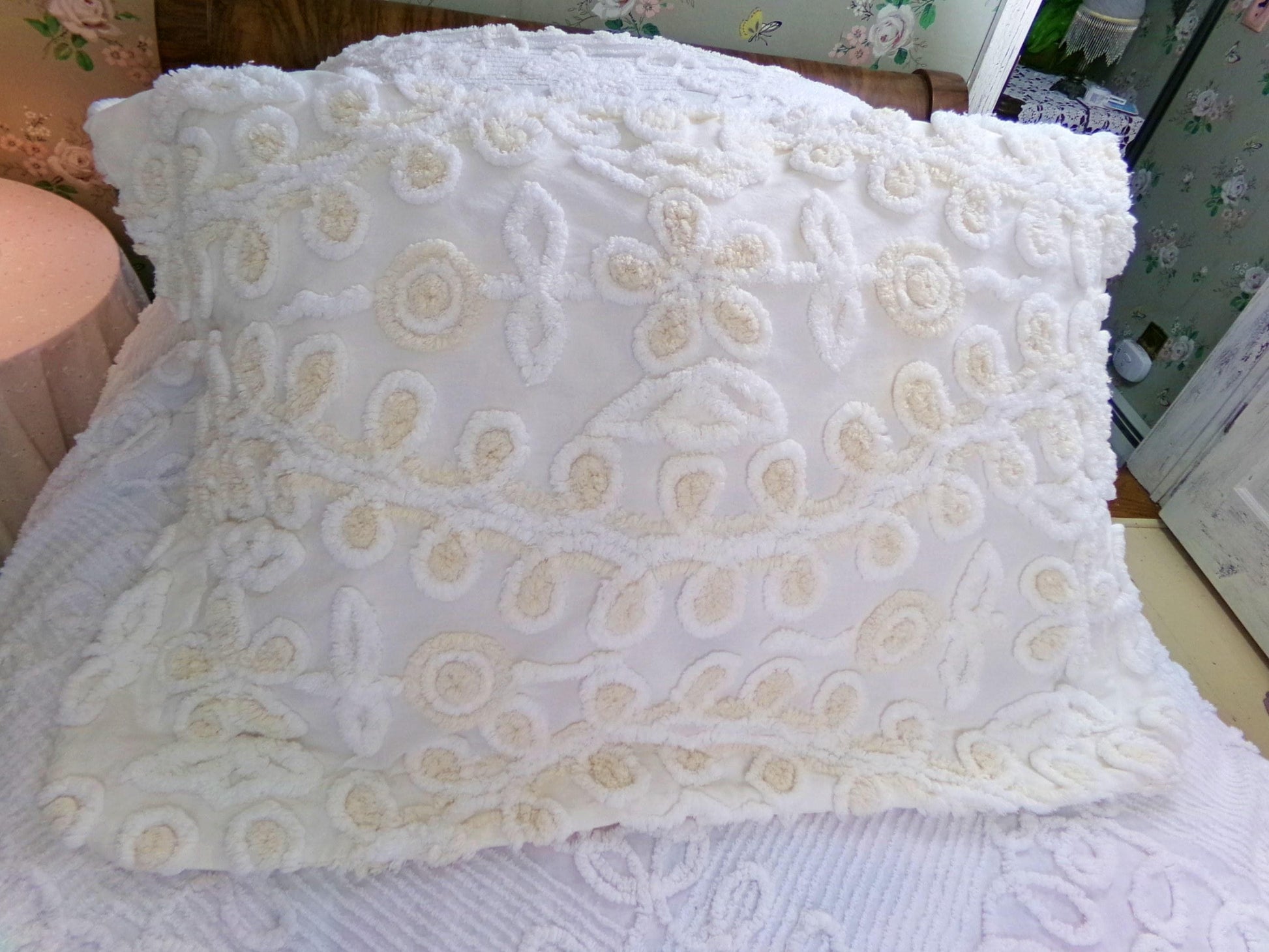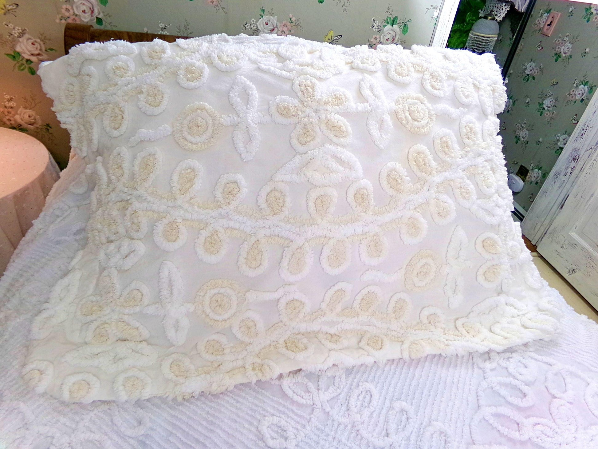 Rare SINGLE vintage style pillow sham from the infamous Canyon Group chenille. This listing is for ONE pillow sham, not a pair. Pillow form NOT included.Features the classic "wedding cake" design in a tonal cream, which is a challenging color to accurately capture, even in bright light.