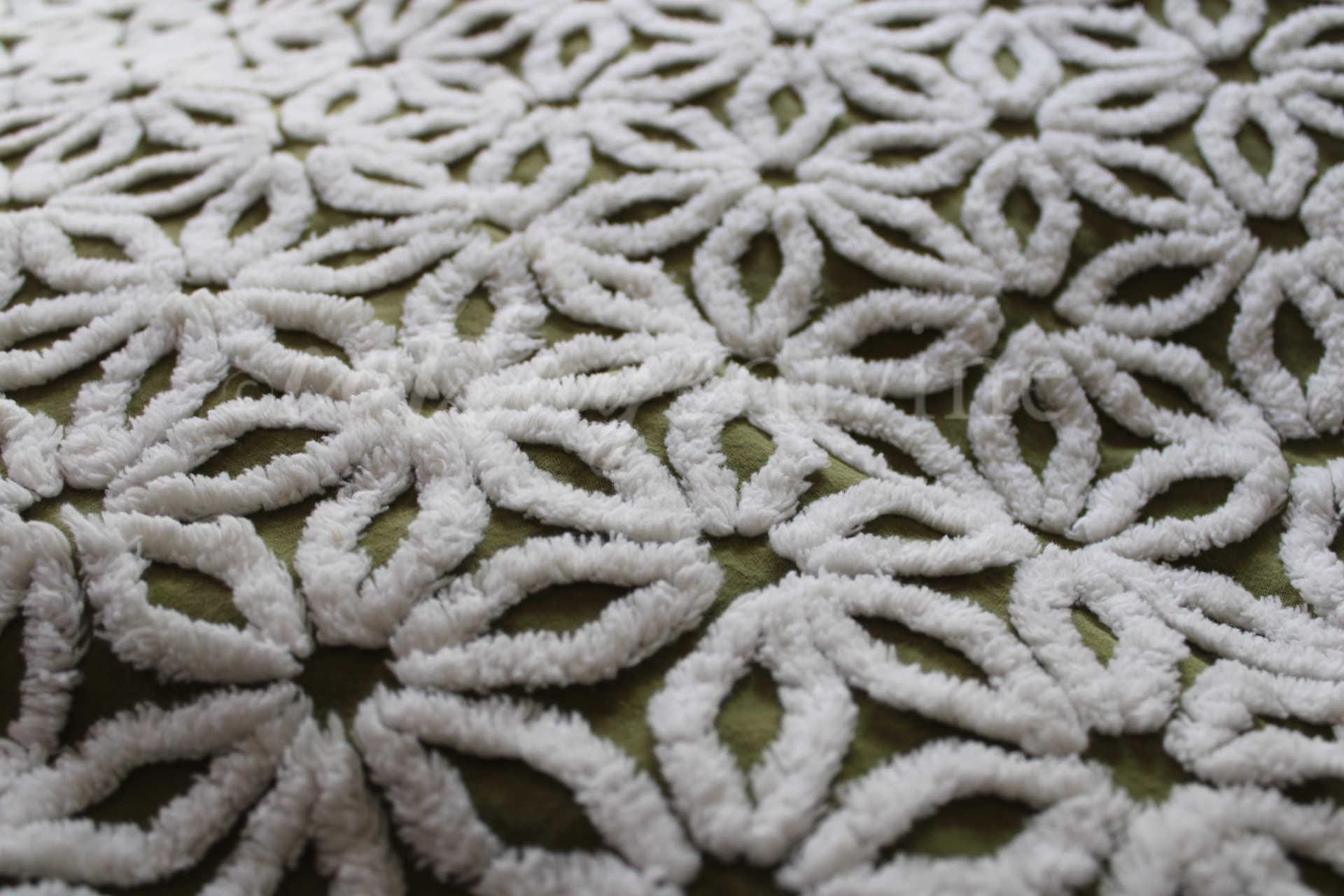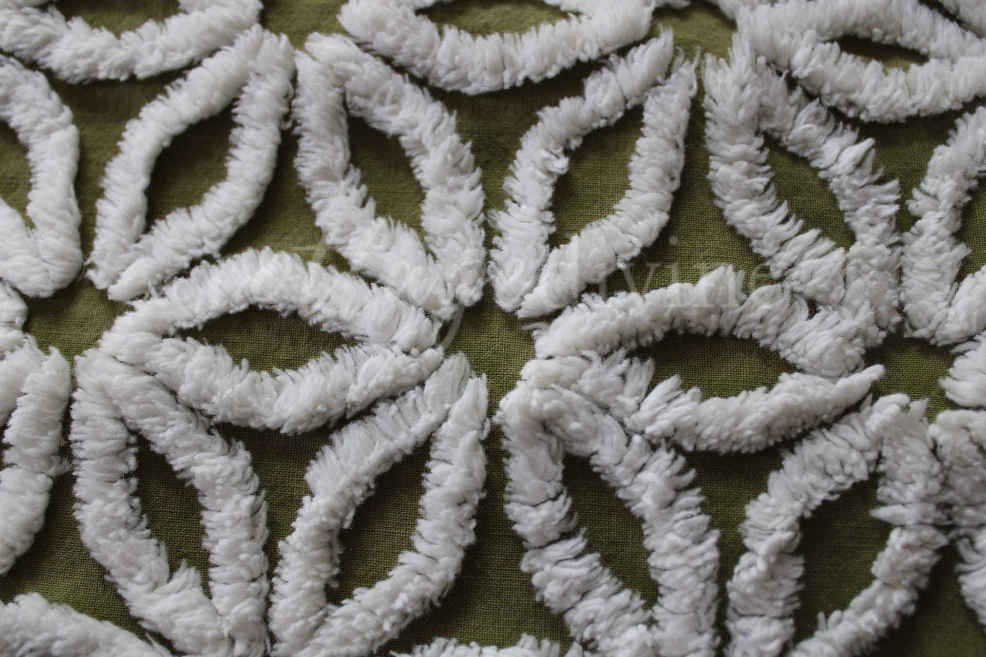 One of our most popular vintage chenille fabrics...this piece features the beloved white daisy pattern on a wonderful earthy boho green. It's absolutely beautiful and a striking contrast to the more commonly seen daisy pattern in pastel colortones.The color is very adaptive to light, so I've taken photos in high/low settings for you to see.