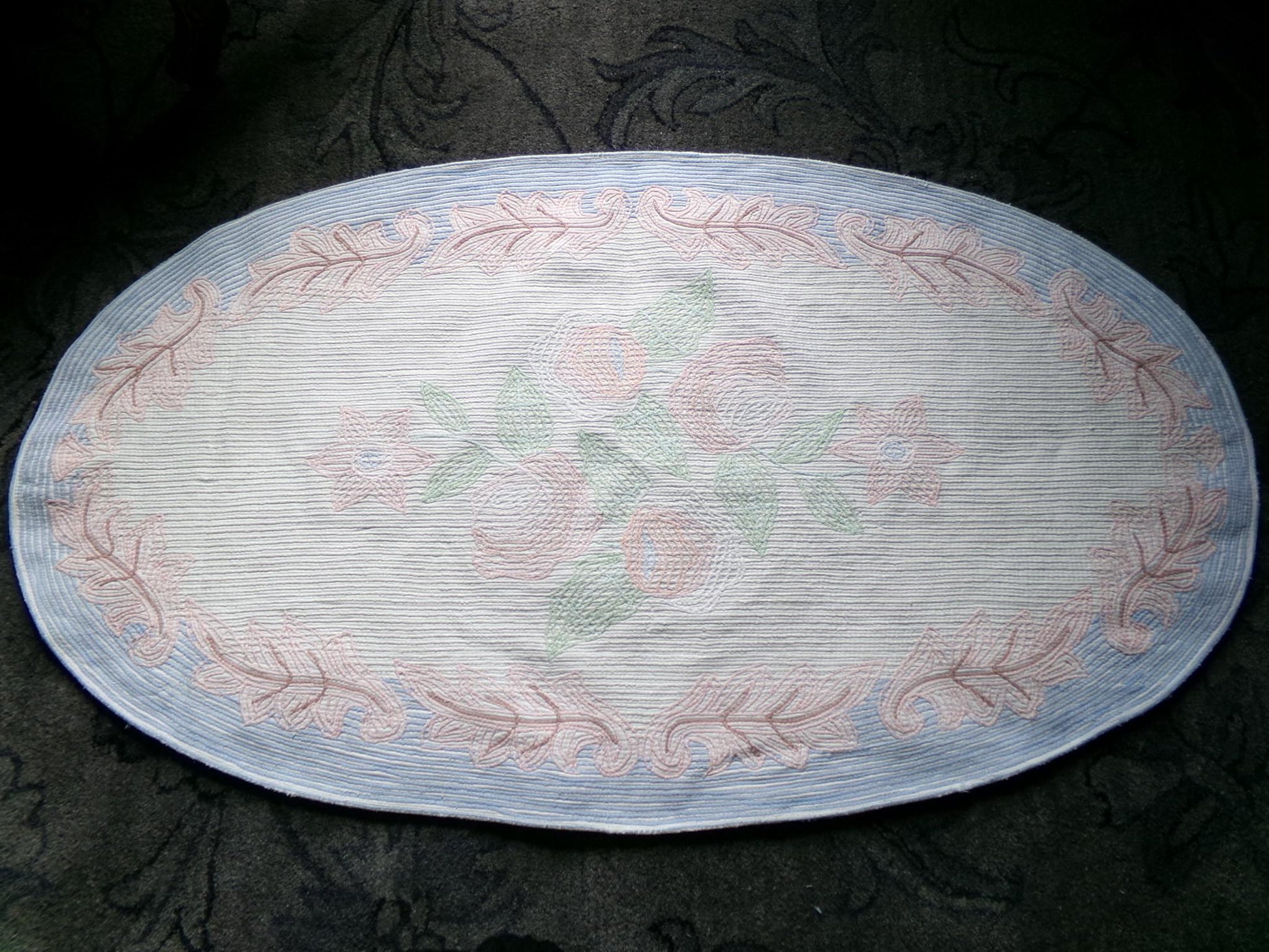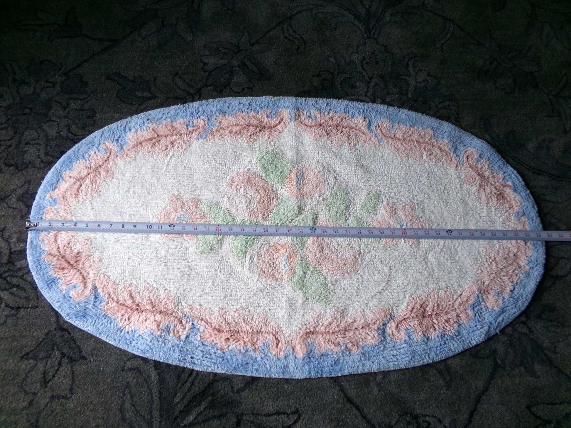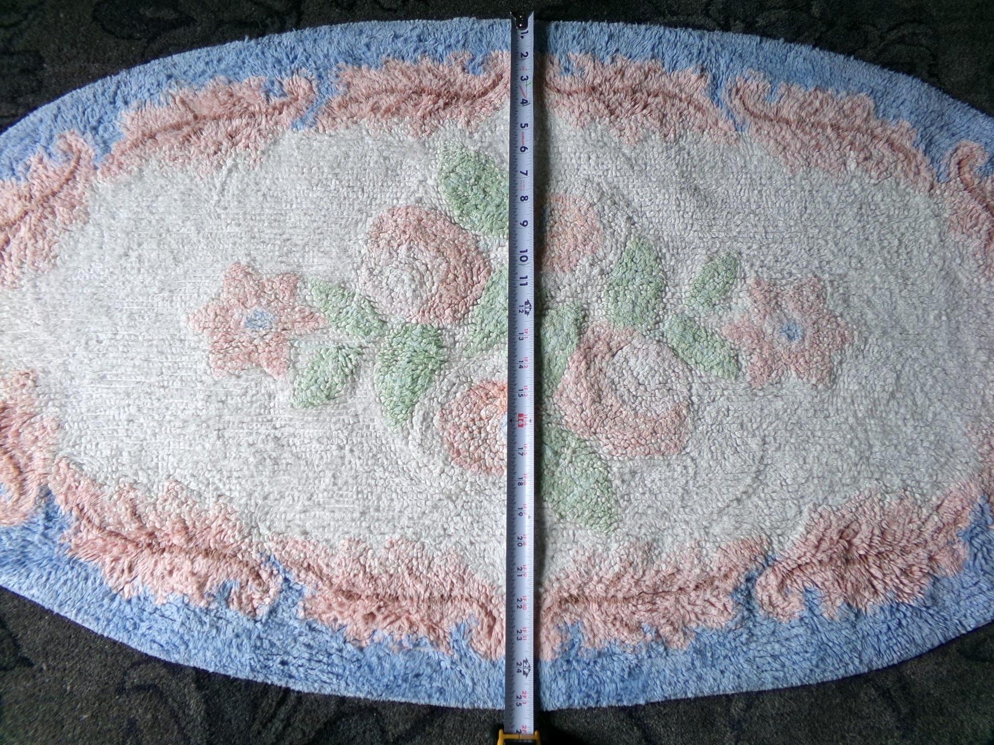 This is such a beautiful vintage chenille rug, especially if you appreciate the cottagecore aesthetic. It features an elegant oval design that surrounds a graceful muted rose floral design framed by tonal pink leaves. The background of the mat is a creamy warm white, trimmed in sky blue.100% heavyweight cotton. Measures approx 25" Wide x 44" Long, so it will make a nice size accent mat in your bedroom, bath, or wherever you're inspired to display it. Excellent quality chenille - this is a heavy mat, not one of the thin flimsy ones that were more common during the mid-century era. Some fraying to edges which lends a great shabby look.